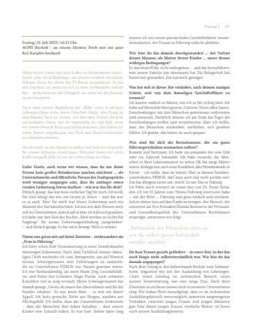 Freitag | 11. Juli 2025 | 14:33 Uhr46395 Bocholt | an einem kleinen Teich mit ein paar Koi-Karpfen hockendW%u00e4hrend die Ladies sich zum Kaffee im Wohnzimmer niederlassen, gehe ich in Bodenlage, um unserer sichtlich entz%u00fcckten Fellnase Paula bei ihrem Koi-TV-Ritual zuzuschauen. Es hat den Anschein, als wenn sie sich in diese Farbkarpfen verliebt hat %u2013 verbunden mit der F%u00e4higkeit, sie schon an der Haust%u00fcr zu erschnuppern.Nach einer kurzen Begr%u00fc%u00dfung von %u201eMilla%u201c, einer 12-j%u00e4hrigen Labrador-Dame nebst deren Fr%u00e4uchen Gisela, eilte Paula zu dem kleinen Teich im Atrium, um dort dem Treiben der Kois zuzuschauen. Etwas, was sie regelm%u00e4%u00dfig tut und liebt, wenn wir unsere Freunde Katja und Stefan besuchen. Dort haben wir schon Szenen eingefangen, wie Fisch und Hund miteinander zu schmusen scheinen.Zeit f%u00fcr mich, zu den Damen zu sto%u00dfen und Teile des Gespr%u00e4chs f%u00fcr unsere Kolumne einzufangen. W%u00e4hrend Gisela mir einen Kaffee eingie%u00dft, falle ich mit der ersten Frage ins Haus: Liebe Gisela, auch wenn wir wissen, dass du um deine Person kein gro%u00dfes Brimborium machen m%u00f6chtest %u2026 als Unternehmerin und %u00f6ffentliche Person des Stadtgespr%u00e4chs wird wenigen entgangen sein, dass du unl%u00e4ngst einen runden Geburtstag feiern durftest %u2013 wie war das f%u00fcr dich?Ehrlich gesagt, das war kein einfacher Tag f%u00fcr mich. Ich wei%u00df, f%u00fcr viele klingt das wie ein Grund zu feiern %u2013 und das war es ja auch. Aber f%u00fcr mich war dieser Geburtstag auch ein Moment der Nachdenklichkeit. Ich bin mit dem Herzen noch voll im Unternehmen, mein Kopf ist klar, ich will noch gestalten. Ich habe mir den Titel des Buches %u201e%u00c4lter werden ist nichts f%u00fcr Feiglinge%u201c f%u00fcr meine Geburtstagseinladung %u201eausgeliehen%u201c %u2013 und ehrlich gesagt: Es hat mich bewegt. Weil es stimmt.Nimm uns gerne mit auf deine Zeitreise %u2013 insbesondere als %u201eFrau in F%u00fchrung.%u201cIch hatte schon fr%u00fch Verantwortung in einer Anwaltskanzlei %u00fcbertragen bekommen. Nach dem Unfalltod meines damaligen Chefs wechselte ich zum Amtsgericht, um auf Wunsch meines Schwiegervaters dort Erfahrungen zu sammeln, die im Unternehmen PIERON von Nutzen gewesen w%u00e4ren. Ich war f%u00fcnfunddrei%u00dfig, als mein Mann J%u00f6rg, Gesch%u00e4ftsf%u00fchrer und Enkel des Gr%u00fcnders Hugo Pieron, nach schwerer Krankheit viel zu jung verstarb. Meine Schwiegermutter hat damals gesagt: %u201eGisela, du musst das %u00fcbernehmen und f%u00fcr die Familie erhalten.%u201c Es war keine Bitte %u2013 es war ein klarer Appell. Ich hab%u2019s gemacht. Nicht aus Ehrgeiz, sondern aus Pflichtgef%u00fchl. Ich wollte, dass das Unternehmen fortbesteht %u2013 dass die Menschen ihre Arbeit behalten %u2013 dass unsere Kinder eine Zukunft haben. Es war hart. Sieben Jahre lang musste ich mit einem patriarchalen Gesch%u00e4ftsf%u00fchrer zusammenarbeiten, der Frauen in F%u00fchrung schlicht ablehnte.Wie hast du das damals durchgestanden %u2026 der Verlust deines Mannes, als Mutter dreier Kinder %u2026 unter diesen widrigen Bedingungen?Es war mein Wille, nicht aufzugeben %u2026 und das fortzuf%u00fchren, was unsere Familie uns %u00fcberlassen hat. Die Belegschaft hat hinter mir gestanden. Das hat mich getragen.Was hat sich in dieser Zeit ver%u00e4ndert, nach deinem mutigenSchritt, sich von dem damaligen Gesch%u00e4ftsf%u00fchrer zu trennen?Ich konnte endlich so f%u00fchren, wie ich es f%u00fcr richtig hielt. Ich habe auf Menschlichkeit gesetzt. Zuh%u00f6ren. T%u00fcren offen lassen. Entscheidungen mit den Menschen gemeinsam vorbereiten und umsetzen. Nat%u00fcrlich musste ich am Ende des Tages die Entscheidungen treffen und verantworten. Aber ich wollte, dass die Menschen mitdenken, mitf%u00fchlen, sich gesehen f%u00fchlen. Ich glaube, das haben sie auch gesp%u00fcrt.Was sind f%u00fcr dich die Kernelemente, die ein gutes F%u00fchrungsverhalten ausmachen sollten?Respekt und Vertrauen. Ich habe nie jemanden wie eine Zahl oder ein Zahnrad behandelt. Ich habe versucht, die Menschen in ihrer Lebenssituation zu sehen. Ob das junge M%u00fctter waren, Kolleginnen nach einer Krankheit oder Mitarbeitende in Krisen %u2013 ich wollte, dass sie wissen: Hier, in diesem Familienunternehmen PIERON, darf man auch mal nicht perfekt sein. Das hat %u00fcbrigens nichts mit %u201eweich%u201c zu tun. Das ist Haltung.Ich f%u00fchle mich erinnert an einen Satz von Dr. Franz Netta, den ich vor 15 Jahren zum Thema F%u00fchrung interviewt habe %u2013 mit der Bitte %u2026 F%u00fchrung mal ganz einfach und verst%u00e4ndlich in einem Satz auf den Punkt zu bringen. Der Mensch, der seinerzeit als Vice President Human Resources die Personalund Gesundheitspolitik des Unternehmens Bertelsmann mitpr%u00e4gte, antwortete wie folgt:%u201eBehandele die Menschen stets so,wie du selbst gerne behandelt werden w%u00fcrdest.%u201cDu hast Frauen gezielt gef%u00f6rdert %u2013 in einer Zeit, in der das noch l%u00e4ngst nicht selbstverst%u00e4ndlich war. Wie bist du das damals angegangen?Nach dem Umzug in den Industriepark Bocholt, zum Schlavenhorst, begannen wir mit der Ausbildung von Lehrlingen. Unser erster Lehrling im technischen Bereich, unter meiner Verantwortung, war eine junge Frau. Nach ihrer Elternzeit ist sie heute immer noch in unserem Unternehmen t%u00e4tig. Wir haben Wert daraufgelegt, dass es im technischen Ausbildungsbereich, wenn m%u00f6glich, immer ein ausgewogenes Verh%u00e4ltnis zwischen jungen Frauen und jungen M%u00e4nnern gab. Eine dieser jungen Frauen, vierfache Mutter, ist heute noch unsere Ausbildungsleiterin.Portrait I 57