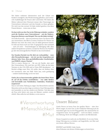 Wir haben verk%u00fcrzte Arbeitszeiten nach der Geburt von Kindern erm%u00f6glicht, den Wiedereinstieg gef%u00f6rdert, auch technische Ausbildungen f%u00fcr Frauen aktiv unterst%u00fctzt. Wir haben die M%u00fctter w%u00e4hrend ihrer Elternzeit immer %u00fcber Neuerungen im Unternehmen informiert und den Kontakt zu ihnen gehalten. F%u00fcr mich war das normal. Ich habe einfach gesehen, was diese Frauen k%u00f6nnen %u2013 wenn man sie l%u00e4sst.Du hast nicht nur den Ton in der F%u00fchrung ver%u00e4ndert, sondern auch die Struktur eures Unternehmens %u2013 mit der Einberufung eines Beirates zum Beispiel. Was war dir dabei wichtig?Ich wollte Kontrolle %u2013 aber im positivsten Sinne. Der Beirat sollte uns unterst%u00fctzen, den Blick zu weiten. Professor Dr. Hentze aus M%u00fcnster war einer der ersten, den ich daf%u00fcr gewinnen konnte. Er steht uns heute noch zur Seite. Es ging darum, dass niemand %u2013 auch ich nicht %u2013 Entscheidungen im Alleingang trifft, ohne andere Perspektiven zu h%u00f6ren. Gerade bei Themen wie Nachfolge oder dem demografischen Wandel ist das entscheidend.Der Standort Bocholt war f%u00fcr dich nie verhandelbar %u2013 trotz aller Herausforderungen %u2013 wie wir aus den Gespr%u00e4chen mit deinem Sohn Sven, dem gesch%u00e4ftsf%u00fchrenden Gesellschafter von PIERON, wissen. Warum?Weil es unsere Heimat ist %u2013 f%u00fcr uns als Familie, aber auch f%u00fcrs Unternehmen. Wir sind hier seit 1925. Selbst als die Joint Ventures in den USA 2001 und in China 2005 dazukamen %u2013 in Bocholt schl%u00e4gt unser Herz. Ich wollte, dass wir bleiben, dass wir investieren, aber mit Ma%u00df. Nicht laut, nicht gro%u00dfspurig %u2013 sondern bodenst%u00e4ndig, so wie wir sind.Gisela, der zu Interviewenden geb%u00fchrt das letzte Wort: Wenn du auf all das Erlebte zur%u00fcckblickst %u2013 was sollte bleiben und bestenfalls zum Nachdenken, Umdenken, Neudenken inspirieren?Dass es sich lohnt, Haltung zu zeigen. Das Menschliche und den Menschen nicht aus dem Auge zu verlieren. Dass F%u00fchrung nichts mit Lautst%u00e4rke zu tun hat, sondern mit Klarheit. Und dass man als Frau nicht h%u00e4rter sein muss als M%u00e4nner, sondern einfach ehrlich. Man sollte bei sich bleiben, so wie man ist.Unsere Bilanz:Gisela Pieron ist keine Frau der gro%u00dfen Worte %u2013 aber ihre Worte tragen. In einer Zeit, in der weibliche F%u00fchrung noch als Ausnahme galt, hat sie den Weg gew%u00e4hlt, den niemand f%u00fcr sie vorgesehen hatte. Sie hat gef%u00fchrt %u2013 nicht mit H%u00e4rte, sondern mit Haltung. Nicht mit Ellbogen, sondern mit Blickkontakt.Dieses Gespr%u00e4ch ist mehr als ein R%u00fcckblick. Es ist eine Einladung, F%u00fchrung neu zu denken: auf Augenh%u00f6he, mit Mut und mit einem offenen Herzen.RESPEKT und DANKE, liebe Gisela,diese Kolumne mit deinen Erfahrungen zu bereichern.#Verantwortung#Menschlichkeit#Mut 58 I Portrait