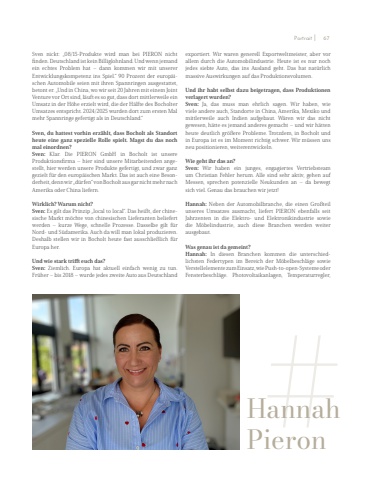 Sven nickt: %u201e08/15-Produkte wird man bei PIERON nicht finden. Deutschland ist kein Billiglohnland. Und wenn jemand ein echtes Problem hat %u2013 dann kommen wir mit unserer Entwicklungskompetenz ins Spiel.%u201c 90 Prozent der europ%u00e4ischen Automobile seien mit ihren Spannringen ausgestattet, betont er. %u201eUnd in China, wo wir seit 20 Jahren mit einem Joint Venture vor Ort sind, l%u00e4uft es so gut, dass dort mittlerweile ein Umsatz in der H%u00f6he erzielt wird, die der H%u00e4lfte des Bocholter Umsatzes entspricht. 2024/2025 wurden dort zum ersten Mal mehr Spannringe gefertigt als in Deutschland.%u201cSven, du hattest vorhin erz%u00e4hlt, dass Bocholt als Standort heute eine ganz spezielle Rolle spielt. Magst du das noch mal einordnen?Sven:%u00a0 Klar. Die PIERON GmbH in Bocholt ist unsere Produktionsfirma %u2013 hier sind unsere Mitarbeitenden angestellt, hier werden unsere Produkte gefertigt, und zwar ganz gezielt f%u00fcr den europ%u00e4ischen Markt. Das ist auch eine Besonderheit, denn wir %u201ed%u00fcrfen%u201c von Bocholt aus gar nicht mehr nach Amerika oder China liefern.Wirklich? Warum nicht?Sven:%u00a0Es gilt das Prinzip %u201elocal to local%u201c. Das hei%u00dft, der chinesische Markt m%u00f6chte von chinesischen Lieferanten beliefert werden %u2013 kurze Wege, schnelle Prozesse. Dasselbe gilt f%u00fcr Nord- und S%u00fcdamerika. Auch da will man lokal produzieren. Deshalb stellen wir in Bocholt heute fast ausschlie%u00dflich f%u00fcr Europa her.Und wie stark trifft euch das?Sven:%u00a0 Ziemlich. Europa hat aktuell einfach wenig zu tun. Fr%u00fcher %u2013 bis 2018 %u2013 wurde jedes zweite Auto aus Deutschland exportiert. Wir waren generell Exportweltmeister, aber vor allem durch die Automobilindustrie. Heute ist es nur noch jedes siebte Auto, das ins Ausland geht. Das hat nat%u00fcrlich massive Auswirkungen auf das Produktionsvolumen.Und ihr habt selbst dazu beigetragen, dass Produktionen verlagert wurden?Sven:%u00a0 Ja, das muss man ehrlich sagen. Wir haben, wie viele andere auch, Standorte in China, Amerika, Mexiko und mittlerweile auch Indien aufgebaut. W%u00e4ren wir das nicht gewesen, h%u00e4tte es jemand anderes gemacht %u2013 und wir h%u00e4tten heute deutlich gr%u00f6%u00dfere Probleme. Trotzdem, in Bocholt und in Europa ist es im Moment richtig schwer. Wir m%u00fcssen uns neu positionieren, weiterentwickeln.Wie geht ihr das an?Sven:%u00a0 Wir haben ein junges, engagiertes Vertriebsteam um Christian Fehler herum. Alle sind sehr aktiv, gehen auf Messen, sprechen potenzielle Neukunden an %u2013 da bewegt sich viel. Genau das brauchen wir jetzt!Hannah: Neben der Automobilbranche, die einen Gro%u00dfteil unseres Umsatzes ausmacht, liefert PIERON ebenfalls seit Jahrzenten in die Elektro- und Elektronikindustrie sowie die M%u00f6belindustrie, auch diese Branchen werden weiter ausgebaut. Was genau ist da gemeint?Hannah: In diesen Branchen kommen die unterschiedlichsten Federtypen im Bereich der M%u00f6belbeschl%u00e4ge sowie Verstellelemente zum Einsatz, wie Push-to-open-Systeme oder Fensterbeschl%u00e4ge. Photovoltaikanlagen, Temperaturregler, HannahPieron#Portrait I 67