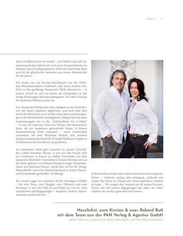 Auch im Bahia waren wir wieder %u2013 der Herbel Cup steht an, und passend dazu liefern wir euch einen Sommerbericht mit Sommer-Sauna-Feeling inklusive. Wenn ihr Gl%u00fcck habt, dann seid ihr die gl%u00fccklichen Gewinner von einem Monatsticket f%u00fcr die Sauna %u2026Wir haben uns mit Nicolas Brinckmann von der Wohnbau Westm%u00fcnsterland verabredet und einen zweiten Einblick in das gro%u00dfartige Bauprojekt 7H%u00f6fe bekommen %u2013 es nimmt Gestalt an und wir hatten die Gelegenheit, in fast fertige Wohnungen hineinzuschnuppern. Ein tolles Konzept f%u00fcr modernes Wohnen an der Aa.Der Smutje der PANkitchen hatte %u00fcbrigens in der Zwischenzeit auf einem Segelboot angeheuert, und nach dem T%u00f6rn durch die Weltmeere ist er wieder voller Ideen und Anregungen in den Heimathafen zur%u00fcckgekehrt. Mitgebracht f%u00fcr dieseSommerausgabe hat er das %u201eClubSandwich der 4 H%u00e4fen%u201c %u2026 Es war im wahrsten Sinne des Wortes eine kulinarische Reise, die wir zusammen gebrutschelt haben. In diesem Zusammenhang: Nicht verpassen %u2013 unser Gewinnspiel zusammen mit dem Weinhaus Bocholt und unserem Kooperationspartner dem PAN-Weingut Pfaffmann. Es gibt ein Prickelwasser der Extraklasse zu gewinnen %u2026Ein besonderer Dank geht nat%u00fcrlich an unsere Coverhelden. Lieber Sebastian Thieme, es war uns eine Freude, dich im Ceramstore in Kaarst zu treffen! Entstanden aus dem bekannten Bocholter Unternehmen Fliesen H%u00fcning und aus der Taufe gehoben von Roland H%u00fcning in enger Zusammenarbeit mit Sebastian Thieme, wurde hier ein Ort f%u00fcr Design, Materialliebe und echte Wohninspiration in dieser Fliesenund Keramikwelt geschaffen. Gro%u00dfartig!Wie immer sagen wir nat%u00fcrlich ALLEN Beteiligten DANKE %u2013 f%u00fcr eure Treue, eure Neugier, eure Offenheit und euer Vertrauen in uns. Der PAN ist und bleibt ein Ort f%u00fcr echte Geschichten und Begegnungen %u2013 inspiriert, ehrlich, manchmal wild, manchmal leise.In diesem Sinne, habt einen sch%u00f6nen Sommer und entspannteFerien %u2013 vielleicht analog oder analogital, vielleicht mit einem Glas Wein im Urlaub oder einem gek%u00fchlten Getr%u00e4nk at home %u2026 Wir m%u00f6gen den Sommer mit all seinen Facetten, freuen uns auf weitere Begegnungen mit allen, die lieber zuh%u00f6ren als urteilen, genie%u00dfen statt hetzen %u2026Herzlichst, eure Kirsten & euer Roland Bu%u00df mit dem Team aus der PAN Verlag & Agentur GmbH#PAN VERLAG & AGENTUR #DER PAN #DAS COFFEETABLEMAGAZINKultur I 5