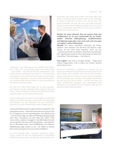 menschlich. Das zweite Bild, welches Sven beim Blick %u00fcber seinen Curved-Flat-Screen genie%u00dfen darf, ist der Astbergseein Going in %u00d6sterreich. Er sagt, es sei wie das erste eine private Fotografie von ihm, die durch die beiden K%u00fcnstlerfreunde aus D%u00fcsseldorf nachgemalt worden sei. Es tue einfach gut, im Arbeitsalltag einen Blick auf einen seiner Lieblingsurlaubsorte werfen zu k%u00f6nnen.Machen wir einen Schwenk. Was aus unserer Sicht sehr erz%u00e4hlenswert ist, ist eure Leidenschaft f%u00fcr die Tr%u00f6delm%u00e4rkte. Zwischen Hallenplanung, Azubibrosch%u00fcren und Digitalstrategie gibt es bei euch auch noch eine ganz %u201everwegene%u201c andere Leidenschaft.Hannah: Wir stehen tats%u00e4chlich manchmal auf Tr%u00f6delm%u00e4rkten. Ganz klassisch mit Biertisch und Kartons voller Sachen, die wir nicht mehr brauchen. Nicht aus Not %u2013 sondern aus Freude. Ja, wirklich. %u201eViele finden das befremdlich%u201c, sagt Hannah und lacht. Diese Mischung aus Menschen, Gespr%u00e4chen, %u00dcberraschungen %u2013 wir lieben es.Sven erg%u00e4nzt: %u201eWir sind so erzogen worden %u2013 Dinge nicht einfach wegzuwerfen. Und es macht uns Freude, anderen etwas Gutes zu tun.%u201c Manchmal verschenken sie Kleidung an Familien, die sie brauchen, manchmal wird gefeilscht, manchmal entdeckt man echte Sch%u00e4tze, denn nat%u00fcrlich wird auch bei den Nachbarst%u00e4nden vorbeigeschaut und das ein oder andere Teil gekauft. Wie beispielsweise den %u201eSchnapp%u201c, die Junghans-Taschenuhr, die Sven einst f%u00fcr 5 Euro erstand %u2013 und die sich sp%u00e4ter als echtes Sammlerst%u00fcck entpuppte. Zum hinterfragten Wert bekommen wir ein L%u00e4cheln von Sven. Junghans h%u00e4tte die Uhr gerne f%u00fcrs eigene Museum gehabt. %u00dcberhaupt ist das F%u00fchrungsteam bei PIERON etwas Besonderes. Neben Sven und Christian pr%u00e4gte auch Gisela Pieron %u2013 Svens Mutter %u2013 bis 2014 die DNA des Unternehmens. Sven erz%u00e4hlt, dass sie mit 80 Jahren noch aktiv ist %u2013 wenn auch nicht mehr operativ. Und ein Wunsch steht im Raum: noch mindestens 15 Jahre %u201ePierontum%u201c%u2013 mit zwei starken F%u00fchrungspersonen, Christian Fehler und Sven Pieron, die das Unternehmen in die n%u00e4chste Generation tragen. Die Sicht von Gisela Pieron haben wir in einem gesonderten Gespr%u00e4ch auf den vorherigen Seiten platziert. Denn das Thema %u201eFrauen in F%u00fchrung%u201c, welches wir im PAN mit einer Serie begonnen haben, ist hier historisch bedeutsam. Zur%u00fcck ins Jetzt und in das B%u00fcro von Sven Pieron. An der Wand h%u00e4ngt ein Gem%u00e4lde, das sofort ins Auge f%u00e4llt. Zwei Bergsteiger auf schroffem Grat, die Silhouetten rau und eindrucksvoll gezeichnet. Ein weiter Himmel, klare Linien, kr%u00e4ftige Farben.%u201eDas sind Christian und ich%u201c, sagt Sven Pieron und l%u00e4chelt.%u00a0%u201eWir beide gehen voraus %u2013 damit das Team hinter uns sicheren Tritt hat. Es zeigt uns, wie wir vorneweg gehen, den Pfad bereiten %u2013 und das Team folgt, wir f%u00fchren die Belegschaft gemeinsamnach oben. Gemeinsam auf dem Weg zum Gipfel. Nicht vorne stehen, sondern vorangehen. Das Bild haben Freunde von uns gemalt, Xin Zhou und Yunong Wang %u2013 zwei K%u00fcnstler, die in D%u00fcsseldorf leben. Josef Middelkamp (von Rahmen Middelkamp) sagte einmal zu mir: %u201eDie Bilder in deinem B%u00fcro m%u00fcssen dir guttun. Du musst dich wohlf%u00fchlen.%u201c Es ist ein kraftvolles Bild %u2013 emotional, symbolisch, nahbar. Und es erz%u00e4hlt viel %u00fcber den F%u00fchrungsstil im Unternehmen PIERON. Gemeinsam, aber mit Richtung. Verantwortlich, aber Portrait I 69