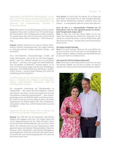 Bodenhaftung ist bei PIERON kein Marketingbegriff %u2013 sie wird gelebt. Auch in ihrer Rolle als Arbeitgeber. Das Gespr%u00e4ch wird nachdenklicher. Wir sprechen %u00fcber die Ver%u00e4nderung in der Arbeitswelt, %u00fcber Fachkr%u00e4ftemangel, Generation Z, Nachwuchsgewinnung.Sven: Fr%u00fcher hatten wir zehn Bewerbungen auf einen Ausbildungsplatz. Heute sind es vielleicht zwei. Die Auswahl ist gut, aber %u00fcbersichtlich. Viele Schulabsolventen wollen studieren, erst einmal reisen oder sind sich nicht sicher, welchen Beruf sie erlernen wollen. Oder sie wollen alles %u2013 au%u00dfer Verantwortung.Hannah: Deshalb investieren wir stark in Schulen, Messeauftritte, Projekte und Kooperationen. Wir zeigen: Industrie ist nicht grau und laut, sondern spannend, wichtig %u2013 und menschlich.Trotz wirtschaftlicher Herausforderungen wurden alle Azubis %u00fcbernommen. %u201eDas ist f%u00fcr uns eine Herzensangelegenheit%u201c, sagt Sven. %u201eOftmals bewegen wir uns antizyklisch am Markt %u2013 bisweilen auch gegen die Wirtschaftlichkeit. Aber wir glauben an Menschen.%u201c Hannah erg%u00e4nzt: %u201eEs ist heute nicht mehr leicht, junge Leute f%u00fcr eine Ausbildung zu begeistern.%u201c Doch PIERON bleibt dran. Mit Messen, Schulbesuchen, Pr%u00e4senz %u2013 und einer klaren Haltung: %u201eWir stehen f%u00fcr Ausbildung und f%u00fcr Perspektive.%u201cSeit%u00a02019%u00a0verschiebt sich das Gesch%u00e4ft enorm von Verbrennungsmotor zu E-Mobilit%u00e4t. Neue Produkte wie%u00a0 DC-LadetechnikKontakte,%u00a0 Kupfer-Ringfedern, stromleitende Federn f%u00fcr Schnellladesysteme entstehen. Die strategische Ausrichtung auf Zukunftsm%u00e4rkte ist un%u00fcbersehbar %u2013 aber immer mit dem Gedanken: %u201eStruktur und Substanz statt Hype.%u201c In den letzten Jahren hat sich das Unternehmen strukturell weiterentwickelt. %u2013 Neue Firmengr%u00fcndungen neben der PIERON GmbH, um Risiken zu verteilen, Chancen zu nutzen und neue Wege zu gehen. %u201eWir haben beispielsweise f%u00fcr Bruker-Spaleck eine neue Produktionsst%u00e4tte gebaut%u201c, erkl%u00e4rt Sven. %u201eSolche Projekte st%u00e4rken uns und die Region.%u201cEngagement h%u00f6rt f%u00fcr das Ehepaar nicht am Werkstor auf. Hannah ist bei den Bocholter Soroptimistinnen aktiv. Hannah: Seit 2020 bin ich im Soroptimist Club Bocholt Mitglied und engagiere mich dort. Seit einigen Jahren bin ich im Organisationsteam bei der %u201eH%u00fctte der guten Taten%u201c auf dem Bocholter Weihnachtsmarkt. Das ist so eine sch%u00f6ne Aktion. Wir verkaufen dort von den Clubschwestern selbst gemachte Sachen, wie Eierlik%u00f6r, Weihnachtslik%u00f6re, Pl%u00e4tzchen, Chutneys, So%u00dfen, Neuj%u00e4hrchen und liebevolle Kleinigkeiten. Alles hausgemacht. Die Erl%u00f6se werden f%u00fcr einen guten Zweck, ein Projekt oder eine Einrichtung gespendet, wie zuletzt an den Verein Donum Vitae.Sven (grinst): Ja, und in der Zeit komme ich zu Hause gar nicht mehr in die K%u00fcche! Die ist dann komplett blockiert. Alles voll mit Backblechen, Flaschen, Sch%u00fcsseln, T%u00fcten und Zutaten %u2026 es wird gebacken, gekocht, verziert und etikettiert. Sven, du bist u. a. ehrenamtlicher Pr%u00e4sident des SV Biemenhorst. Was tut sich eigentlich gerade im Vereinsheim? Da geht doch einiges, oder?Sven: Ja, total. Seit etwa drei Jahren haben wir da eine eigene Dart-Abteilung, die mittlerweile richtig aktiv ist. Die trainieren zweimal die Woche, und am Wochenende gibts dann meist ein Turnier %u2013 und das alles in den Vereinsr%u00e4umen direkt vor Ort.Das klingt ziemlich lebendig.Sven: Ist es auch! Und das Sch%u00f6ne ist, der neue P%u00e4chter hat da auch ein klares Ziel. Er will nicht nur die Mitglieder des Vereins erreichen, sondern er m%u00f6chte auch den Biemenhorster an sich mal wieder ins Clubheim holen. Also quasi der SVB als Nachbarschaftstreff?Sven: Genau das. Es soll einfach wieder ein Ort sein, wo man mal spontan hinf%u00e4hrt, um ein Pils zu trinken, ein Spiel zu schauen oder einfach ein bisschen Gemeinschaft zu erleben. Portrait 71 I