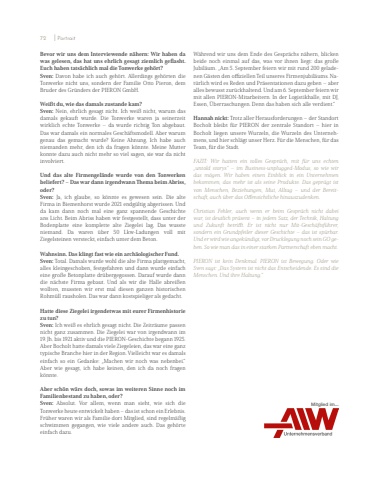 Bevor wir uns dem Interviewende n%u00e4hern: Wir haben da was gelesen, das hat uns ehrlich gesagt ziemlich geflasht. Euch haben tats%u00e4chlich mal die Tonwerke geh%u00f6rt?Sven: Davon habe ich auch geh%u00f6rt. Allerdings geh%u00f6rten die Tonwerke nicht uns, sondern der Familie Otto Pieron, dem Bruder des Gr%u00fcnders der PIERON GmbH.Wei%u00dft du, wie das damals zustande kam?Sven: Nein, ehrlich gesagt nicht. Ich wei%u00df nicht, warum das damals gekauft wurde. Die Tonwerke waren ja seinerzeit wirklich echte Tonwerke %u2013 da wurde richtig Ton abgebaut. Das war damals ein normales Gesch%u00e4ftsmodell. Aber warumgenau das gemacht wurde? Keine Ahnung. Ich habe auch niemanden mehr, den ich da fragen k%u00f6nnte. Meine Mutter konnte dazu auch nicht mehr so viel sagen, sie war da nicht involviert.Und das alte Firmengel%u00e4nde wurde von den Tonwerken beliefert? %u2013 Das war dann irgendwann Thema beim Abriss, oder?Sven: Ja, ich glaube, so k%u00f6nnte es gewesen sein. Die alte Firma in Biemenhorst wurde 2021 endg%u00fcltig abgerissen. Und da kam dann noch mal eine ganz spannende Geschichte ans Licht. Beim Abriss haben wir festgestellt, dass unter der Bodenplatte eine komplette alte Ziegelei lag. Das wusste niemand. Da waren %u00fcber 50 Lkw-Ladungen voll mit Ziegelsteinen versteckt, einfach unter dem Beton.Wahnsinn. Das klingt fast wie ein arch%u00e4ologischer Fund.Sven: Total. Damals wurde wohl die alte Firma plattgemacht, alles kleingeschoben, festgefahren und dann wurde einfach eine gro%u00dfe Betonplatte dr%u00fcbergegossen. Darauf wurde dann die n%u00e4chste Firma gebaut. Und als wir die Halle abrei%u00dfen wollten, mussten wir erst mal diesen ganzen historischen Rohm%u00fcll rausholen. Das war dann kostspieliger als gedacht.Hatte diese Ziegelei irgendetwas mit eurer Firmenhistorie zu tun?Sven: Ich wei%u00df es ehrlich gesagt nicht. Die Zeitr%u00e4ume passen nicht ganz zusammen. Die Ziegelei war von irgendwann im 19. Jh. bis 1921 aktiv und die PIERON-Geschichte begann 1925. Aber Bocholt hatte damals viele Ziegeleien, das war eine ganz typische Branche hier in der Region. Vielleicht war es damals einfach so ein Gedanke: %u201eMachen wir noch was nebenbei.%u201c Aber wie gesagt, ich habe keinen, den ich da noch fragen k%u00f6nnte.Aber sch%u00f6n w%u00e4rs doch, sowas im weiteren Sinne noch im Familienbestand zu haben, oder?Sven: Absolut. Vor allem, wenn man sieht, wie sich die Tonwerke heute entwickelt haben %u2013 das ist schon ein Erlebnis.Fr%u00fcher waren wir als Familie dort Mitglied, sind regelm%u00e4%u00dfig schwimmen gegangen, wie viele andere auch. Das geh%u00f6rte einfach dazu.W%u00e4hrend wir uns dem Ende des Gespr%u00e4chs n%u00e4hern, blicken beide noch einmal auf das, was vor ihnen liegt: das gro%u00dfe Jubil%u00e4um. %u201eAm 5. September feiern wir mit rund 200 geladenen G%u00e4sten den offiziellen Teil unseres Firmenjubil%u00e4ums. Nat%u00fcrlich wird es Reden und Pr%u00e4sentationen dazu geben %u2013 aber alles bewusst zur%u00fcckhaltend. Und am 6. September feiern wir mit allen PIERON-Mitarbeitern. In der Logistikhalle, mit DJ, Essen, %u00dcberraschungen. Denn das haben sich alle verdient.%u201cHannah nickt: Trotz aller Herausforderungen %u2013 der Standort Bocholt bleibt f%u00fcr PIERON der zentrale Standort %u2013 hier in Bocholt liegen unsere Wurzeln, die Wurzeln des Unternehmens, und hier schl%u00e4gt unser Herz. F%u00fcr die Menschen, f%u00fcr das Team, f%u00fcr die Stadt. FAZIT: Wir hatten ein tolles Gespr%u00e4ch, mit f%u00fcr uns echten %u201euntold storys%u201c %u2013 im Business-unplugged-Modus, so wie wir das m%u00f6gen. Wir haben einen Einblick in ein Unternehmen bekommen, das mehr ist als seine Produkte. Das gepr%u00e4gt ist von Menschen, Beziehungen, Mut, Alltag %u2013 und der Bereitschaft, auch %u00fcber das Offensichtliche hinauszudenken.Christian Fehler, auch wenn er beim Gespr%u00e4ch nicht dabei war, ist deutlich pr%u00e4sent %u2013 in jedem Satz, der Technik, Haltung und Zukunft betrifft. Er ist nicht nur Mit-Gesch%u00e4ftsf%u00fchrer, sondern%u00a0 ein Grundpfeiler dieser Geschichte%u00a0 %u2013 das ist sp%u00fcrbar. Und er wird wie angek%u00fcndigt, vor Drucklegung noch sein GO geben. So wie man das in einer starken Partnerschaft eben macht.PIERON ist kein Denkmal. PIERON ist Bewegung. Oder wie Sven sagt:%u00a0%u201eDas System ist nicht das Entscheidende. Es sind die Menschen. Und ihre Haltung.%u201cMitglied im...72 I Portrait