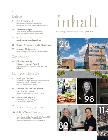 inhaltEst. 1999 I Sommerausgabe 2025 I No. 308Kultur8 KULTUReditorial Kultur ist eine Herzensangelegenheit Unterst%u00fctzt durch die Stadtsparkasse Bocholt10 Veranstaltungen Aasee-Festival, Farmers Rock Festival, REMODE Depeche-Mode-Tributeband...22 Rheder Innenstadtsommer mit buntem Markttreiben24 Rheder Kirmes mit %u201etoller Besetzung%u201c80 Andreas No%u00dfmann Kunst-Highlight 2025 bei der City-Art BocholtCoverstory26 CERAM.store by Fliesen H%u00fcning | Part II PAN on tour | Zum Epizentrum der Keramik in KaarstLiving & Lifestyle50 Analoger Sommer Warum die Young-Generation pl%u00f6tzlich wieder Tagebuch schreibt, Polaroids klebt %u2013 und sich dem Moment hingibt82 Befreien Sie sich von Brillenund Kontaktlinsen mit der implantierbaren EVO ICL-Linse88 Der MINI Cooper C Innovatives In-Car Gaming und traditioneller Fahrspa%u00df97 Cluburlaub Alles Inklusive f%u00fcr K%u00f6rper, Geist und Seele!104 Bahia %u2013 Wo Aufg%u00fcsse zur Kunst werden Der 3. Sauna Herbal Cup am 16. & 17. August 2025 und Erlebnisse in der Sommersauna Schwitzen, Sonne & die neue Swet Kamer269890821146