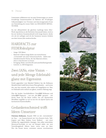 Gemeinsam reflektieren wir ein paar Erinnerungen an unsereletztj%u00e4hrige Zusammenarbeit im Rahmen der 20-j%u00e4hrigen Selbstst%u00e4ndigkeit von Christian und dem kongenialen Event zur Einweihung der neuen Halle von BOLLMANN METALLTECHNIK.Da wir offensichtlich die gleichen Laufwege beim AfterWork-Aper%u00f6lchen in der Bocholter Innenstadt haben, wird es bis zur n%u00e4chsten Zusammenkunft nicht lange dauern, denke ich, als wir auflegen und ich die Summery unseres Artikels aus dem letzten Jahr niederschreibe: HARDFACTS zur FEDERskulptur %u2022 L%u00e4nge: 3,50 Meter %u2022 Material: 6 Meter lange Rohre aus wetterfestem%u201eCortenstahl%u201c mit einer Schutzrostschicht %u2013 bildet eine charakteristische Patina, die das Material sch%u00fctzt, ohne es durchrosten zu lassen%u2022 Fertigung: Rohre verschwei%u00dft und anschlie%u00dfend gewalzt %u2022 Gewicht: ca. 600 KilogrammZwei IANs, eine Vision %u2013 und jede Menge Edelstahlglanz mit EigensinnDirekt gegen%u00fcber vom Bahnhof Haldern hat die Bollmann Metalltechnik GmbH ihren festen Platz gefunden %u2013 auch wenn das, was hier entsteht, alles andere als festgefahren ist. Hier, wo Edelstahl nicht einfach nur gl%u00e4nzt, sondern Haltung zeigt.Was die beiden Gesch%u00e4ftsf%u00fchrer ChristIAN Bollmann und SebastIAN Hegmann %u2013 von uns %u201edie IANs%u201c genannt %u2013 mit ihrem Team auf die Beine stellen, hat mit klassischem Metallbau ungef%u00e4hr so viel zu tun wie ein Aperol Spritz mit lauwarmem Kantinenkaffee.Gedankenschmied trifft Ideen-UmsetzerChristian Bollmann, Baujahr 1969, ist der %u201eGernedenker%u201c im Duo %u2013 ein Kunstschmied mit Live-Konzert-Seele, T%u00fcftlergeist und Biker (Indian Scout Bobber) %u2026%u00a0 mit einer Vorliebe f%u00fcr ungew%u00f6hnliche L%u00f6sungen. Sein selbst entwickelter Motorrad-Turntable ist nur ein Beispiel daf%u00fcr, wie weit Vorstellungskraft f%u00fchren kann, wenn man sie l%u00e4sst. Wer ihn besser kennt, entnimmt seinem verschmitzten work in progress78 I Portrait