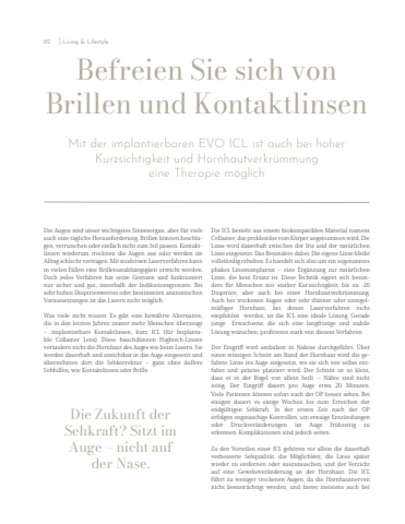 Befreien Sie sich von Brillen und KontaktlinsenDie Augen sind unser wichtigstes Sinnesorgan, aber f%u00fcr viele auch eine t%u00e4gliche Herausforderung. Brillen k%u00f6nnen beschlagen, verrutschen oder einfach nicht zum Stil passen. Kontaktlinsen wiederum trocknen die Augen aus oder werden im Alltag schlecht vertragen. Mit modernen Laserverfahren kann in vielen F%u00e4llen eine Brillenunabh%u00e4ngigkeit erreicht werden. Doch jedes Verfahren hat seine Grenzen und funktioniert nur sicher und gut, innerhalb der Indikationsgrenzen. Bei sehr hohen Dioptrienwerten oder bestimmten anatomischen Voraussetzungen ist das Lasern nicht m%u00f6glich.Was viele nicht wissen: Es gibt eine bew%u00e4hrte Alternative, die in den letzten Jahren immer mehr Menschen %u00fcberzeugt %u2013 implantierbare Kontaktlinsen, kurz ICL (f%u00fcr Implantable Collamer Lens). Diese hauchd%u00fcnnen Hightech-Linsen ver%u00e4ndern nicht die Hornhaut des Auges wie beim Lasern. Sie werden dauerhaft und unsichtbar in das Auge eingesetzt und %u00fcbernehmen dort die Sehkorrektur %u2013 ganz ohne %u00e4u%u00dfere Sehhilfen, wie Kontaktlinsen oder Brille.Mit der implantierbaren EVO ICL ist auch bei hoher Kurzsichtigkeit und Hornhautverkr%u00fcmmung eine Therapie m%u00f6glich Die ICL besteht aus einem biokompatiblen Material namens Collamer, das problemlos vom K%u00f6rper angenommen wird. Die Linse wird dauerhaft zwischen der Iris und der nat%u00fcrlichenLinse eingesetzt. Das Besondere dabei: Die eigene Linse bleibt vollst%u00e4ndig erhalten. Es handelt sich also um ein sogenanntes phakes Linsenimplantat %u2013 eine Erg%u00e4nzung zur nat%u00fcrlichen Linse, die kein Ersatz ist. Diese Technik eignet sich besonders f%u00fcr Menschen mit starker Kurzsichtigkeit, bis zu -20 Dioptrien, aber auch bei einer Hornhautverkr%u00fcmmung. Auch bei trockenen Augen oder sehr d%u00fcnner oder unregelm%u00e4%u00dfiger Hornhaut, bei denen Laserverfahren nicht empfohlen werden, ist die ICL eine ideale L%u00f6sung. Geradejunge Erwachsene, die sich eine langfristige und stabile L%u00f6sung w%u00fcnschen, profitieren stark von diesem Verfahren.Der Eingriff wird ambulant in Nakose durchgef%u00fchrt. %u00dcber einen winzigen Schnitt am Rand der Hornhaut wird die gefaltete Linse ins Auge eingesetzt, wo sie sich von selbst entfaltet und pr%u00e4zise platziert wird. Der Schnitt ist so klein, dass er in der Regel von allein heilt %u2013 N%u00e4hte sind nicht n%u00f6tig. Der Eingriff dauert pro Auge etwa 20 Minuten. Viele Patienten k%u00f6nnen sofort nach der OP besser sehen. Bei einigen dauert es einige Wochen bis zum Erreichen der endg%u00fcltigen Sehkraft. In der ersten Zeit nach der OP erfolgen engmaschige Kontrollen, um etwaige Entz%u00fcndungenoder Druckver%u00e4nderungen im Auge fr%u00fchzeitig zu erkennen. Komplikationen sind jedoch selten.Zu den Vorteilen einer ICL geh%u00f6ren vor allem die dauerhaft verbesserte Sehqualit%u00e4t, die M%u00f6glichkeit, die Linse sp%u00e4ter wieder zu entfernen oder auszutauschen, und der Verzicht auf eine Gewebever%u00e4nderung an der Hornhaut. Die ICL f%u00fchrt zu weniger trockenen Augen, da die Hornhautnerven nicht beeintr%u00e4chtigt werden, und bietet meistens auch bei Die Zukunft der Sehkraft? Sitzt im Auge %u2013 nicht auf der Nase.82 I Living & Lifestyle