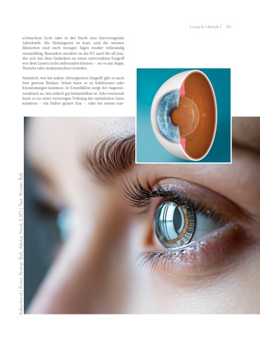 schwachem Licht oder in der Nacht eine hervorragende Sehsch%u00e4rfe. Die Heilungszeit ist kurz, und die meisten Menschen sind nach wenigen Tagen wieder vollst%u00e4ndig einsatzf%u00e4hig. Besonders attraktiv ist die ICL auch f%u00fcr all jene, die sich mit dem Gedanken an einen irreversiblen Eingriff wie dem Lasern nicht anfreunden k%u00f6nnen %u2013 sei es aus Angst, Vorsicht oder medizinischen Gr%u00fcnden.Nat%u00fcrlich, wie bei jedem chirurgischen Eingriff, gibt es auch hier gewisse Risiken. Selten kann es zu Infektionen oder Entz%u00fcndungen kommen. In Einzelf%u00e4llen steigt der Augeninnendruck an, was jedoch gut behandelbar ist. Sehr vereinzelt kann es zu einer vorzeitigen Tr%u00fcbung der nat%u00fcrlichen Linse kommen %u2013 ein fr%u00fcher grauer Star %u2013, oder bei einem starLiving & Lifestyle I 83 Advertorial | Fotos: Kirsten Bu%u00df, Adobe Stock, EVO | Text: Kirsten Bu%u00df