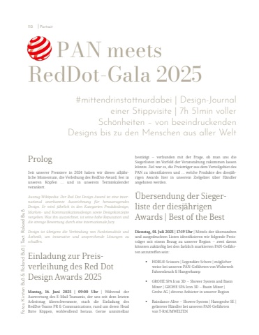 PrologSeit unserer Premiere in 2024 haben wir dieses allj%u00e4hrliche Momentum, die Verleihung des RedDot-Award, fest in unseren K%u00f6pfen %u2026 und in unserem Terminkalender verankert.Auszug Wikipedia:%u00a0 Der Red Dot Design Award ist eine international anerkannte Auszeichnung f%u00fcr herausragendes Design. Er wird j%u00e4hrlich in den Kategorien Produktdesign, Marken- und Kommunikationsdesign sowie Designkonzepte vergeben. Was ihn auszeichnet, ist seine hohe Reputation und die strenge Bewertung durch eine internationale Jury.Design ist %u00fcbrigens die Verbindung von Funktionalit%u00e4t und %u00c4sthetik, um innovative und ansprechende L%u00f6sungen zu schaffen.Einladung zur Preisverleihung des Red DotDesign Awards 2025Montag, 16. Juni 2025 | 09:00 Uhr%u00a0 | W%u00e4hrend der Auswertung des E-Mail-Tsunamis, der uns seit dem letzten Arbeitstag %u00fcberschwemmte, stach die Einladung des RedDot-Teams PR & Communications, rund um deren Head Birte K%u00f6ppen, wohlwollend heraus. Gerne unmittelbar best%u00e4tigt %u2013 verbunden mit der Frage, ob man uns die Siegerlisten im Vorfeld der Veranstaltung zukommen lassen k%u00f6nnte. Ziel war es, die Preistr%u00e4ger aus dem Verteilgebiet des PAN zu identifizieren und %u2026 welche Produkte des diesj%u00e4hrigen Awards hier in unserem Zielgebiet %u00fcber H%u00e4ndler angeboten werden.%u00dcbersendung der Siegerliste der diesj%u00e4hrigenAwards | Best of the BestDienstag, 01. Juli 2025 | 17:19 Uhr%u00a0| Mittels der %u00fcbersandten und ausgedruckten Listen identifizieren wir folgende Preistr%u00e4ger mit einem Bezug zu unserer Region %u2013 zwei davon k%u00f6nnten zuk%u00fcnftig bei den farblich markierten PAN-Gef%u00e4hrten anzutreffen sein:+ HORL%u00ae Scissors%u00a0| Legend%u00e4re Schere | m%u00f6glicher weise bei unseren PAN-Gef%u00e4hrten von Wohnwelt Fahnenbruck & Hungerkamp+ GROHE SPA Icon 3D %u2013 Shower System and Basin Mixer%u00a0| GROHE SPA Icon 3D %u2013 Basin Mixer | Grohe AG | diverse Anbieter in unserer Region+ Raindance Alive %u2013 Shower System%u00a0| Hansgrohe SE | gelisteter H%u00e4ndler bei unseren PAN-Gef%u00e4hrten von T-RAUMWELTEN PAN meetsRedDot-Gala 2025#mittendrinstattnurdabei | Design-Journal einer Stippvisite | 7h 51min vollerSch%u00f6nheiten %u2013 von beeindruckendenDesigns bis zu den Menschen aus aller WeltFotos: Kirsten Bu%u00df & Roland Bu%u00df | Text: Roland Bu%u00df112 I Portrait
