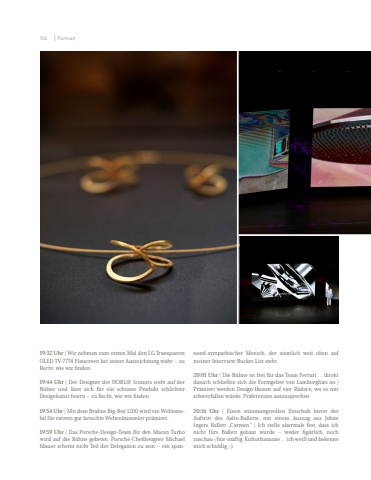 19:32 Uhr%u00a0| Wir nehmen zum ersten Mal den LG Transparent OLED TV-77T4 Flatscreen bei seiner Auszeichnung wahr %u2013 zu Recht, wie wir finden.19:44 Uhr | Der Designer der HORL%u00ae Scissors steht auf der B%u00fchne und l%u00e4sst sich f%u00fcr ein sch%u00f6nes Produkt schlichter Designkunst feiern %u2013 zu Recht, wie wir finden.19:54 Uhr%u00a0| Mit dem Brabus Big-Boy 1200 wird ein Wohnmobil f%u00fcr extrem gut betuchte Weltenbummler pr%u00e4miert.19:59 Uhr%u00a0| Das Porsche-Design-Team f%u00fcr den Macan Turbo wird auf die B%u00fchne gebeten. Porsche-Chefdesigner Michael Mauer scheint nicht Teil der Delegation zu sein %u2013 ein spannend-sympathischer Mensch, der ziemlich weit oben auf meiner Interview-Bucket-List steht.20:01 Uhr%u00a0| Die B%u00fchne ist frei f%u00fcr das Team Ferrari %u2026 direkt danach schlie%u00dfen sich die Formgeber von Lamborghini an | Pr%u00e4miert werden Design-Ikonen auf vier R%u00e4dern, wo es mir schwerfallen w%u00fcrde, Pr%u00e4ferenzen auszusprechen.20:16 Uhr%u00a0 | Einen stimmungsvollen Einschub bietet der Auftritt des Aalto-Balletts: mit einem Auszug aus Johan Ingers Ballett %u201eCarmen.%u201c | Ich stelle abermals fest, dass ich nicht f%u00fcrs Ballett gebaut wurde %u2013 weder fig%u00fcrlich, noch zuschau-/h%u00f6r-m%u00e4%u00dfig. Kulturbanause %u2026 ich wei%u00df und bekenne mich schuldig ;-).116 I Portrait