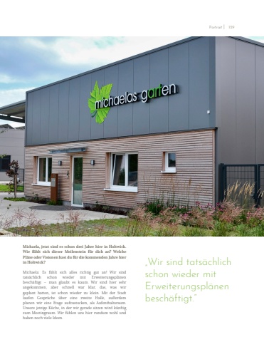 %u201eWir sind tats%u00e4chlich schon wieder mitErweiterungspl%u00e4nen besch%u00e4ftigt.%u201cMichaela, jetzt sind es schon drei Jahre hier in Holtwick. Wie f%u00fchlt sich dieser Meilenstein f%u00fcr dich an? Welche Pl%u00e4ne oder Visionen hast du f%u00fcr die kommenden Jahre hier in Holtwick?Michaela: Es f%u00fchlt sich alles richtig gut an! Wir sind tats%u00e4chlich schon wieder mit Erweiterungspl%u00e4nen besch%u00e4ftigt %u2013 man glaubt es kaum. Wir sind hier sehr angekommen, aber schnell war klar, das, was wir geplant hatten, ist schon wieder zu klein. Mit der Stadt laufen Gespr%u00e4che %u00fcber eine zweite Halle, au%u00dferdem planen wir eine Etage aufzustocken, als Aufenthaltsraum. Unsere jetzige K%u00fcche, in der wir gerade sitzen wird k%u00fcnftig zum Meetingraum. Wir f%u00fchlen uns hier rundum wohl und haben noch viele Ideen.Portrait I 129