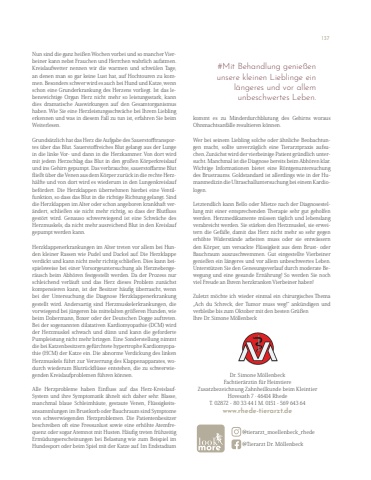 Dr. Simone M%u00f6llenbeckFachtier%u00e4rztin f%u00fcr HeimtiereZusatzbezeichnung Zahnheilkunde beim KleintierHovesath 7 %u00b7 46414 Rhede T. 02872 - 80 33 44 I M. 0151 - 569 643 64www.rhede-tierarzt.de @tierarzt_moellenbeck_rhede @Tierarzt Dr. M%u00f6llenbeckNun sind die ganz hei%u00dfen Wochen vorbei und so mancher Vierbeiner kann nebst Frauchen und Herrchen wahrlich aufatmen. Kreislaufwetter nennen wir die warmen und schw%u00fclen Tage, an denen man so gar keine Lust hat, auf Hochtouren zu kommen. Besonders schwer wird es auch bei Hund und Katze, wenn schon eine Grunderkrankung des Herzens vorliegt. Ist das lebenswichtige Organ Herz nicht mehr so leistungsstark, kann dies dramatische Auswirkungen auf den Gesamtorganismus haben. Wie Sie eine Herzleistungsschw%u00e4che bei Ihrem Liebling erkennen und was in diesem Fall zu tun ist, erfahren Sie beim Weiterlesen. Grunds%u00e4tzlich hat das Herz die Aufgabe des Sauerstofftransportes %u00fcber das Blut. Sauerstoffreiches Blut gelangt aus der Lunge in die linke Vor- und dann in die Herzkammer. Von dort wird mit jedem Herzschlag das Blut in den gro%u00dfen K%u00f6rperkreislauf und ins Gehirn gepumpt. Das verbrauchte, sauerstoffarme Blut flie%u00dft %u00fcber die Venen aus dem K%u00f6rper zur%u00fcck in die rechte Herzh%u00e4lfte und von dort wird es wiederum in den Lungenkreislauf bef%u00f6rdert. Die Herzklappen %u00fcbernehmen hierbei eine Ventilfunktion, so dass das Blut in die richtige Richtung gelangt. Sind die Herzklappen im Alter oder schon angeboren krankhaft ver%u00e4ndert, schlie%u00dfen sie nicht mehr richtig, so dass der Blutfluss gest%u00f6rt wird. Genauso schwerwiegend ist eine Schw%u00e4che des Herzmuskels, da nicht mehr ausreichend Blut in den Kreislauf gepumpt werden kann. Herzklappenerkrankungen im Alter treten vor allem bei Hunden kleiner Rassen wie Pudel und Dackel auf. Die Herzklappe verdickt und kann nicht mehr richtig schlie%u00dfen. Dies kann beispielsweise bei einer Vorsorgeuntersuchung als Herznebenger%u00e4usch beim Abh%u00f6ren festgestellt werden. Da der Prozess nur schleichend verl%u00e4uft und das Herz dieses Problem zun%u00e4chst kompensieren kann, ist der Besitzer h%u00e4ufig %u00fcberrascht, wenn bei der Untersuchung die Diagnose Herzklappenerkrankung gestellt wird. Andersartig sind Herzmuskelerkrankungen, die vorwiegend bei j%u00fcngeren bis mittelalten gr%u00f6%u00dferen Hunden, wie beim Dobermann, Boxer oder der Deutschen Dogge auftreten. Bei der sogenannten dilatativen Kardiomyopathie (DCM) wird der Herzmuskel schwach und d%u00fcnn und kann die geforderte Pumpleistung nicht mehr bringen. Eine Sonderstellung nimmt die bei Katzenbesitzern gef%u00fcrchtete hypertrophe Kardiomyopathie (HCM) der Katze ein. Die abnorme Verdickung des linken Herzmuskels f%u00fchrt zur Verzerrung des Klappenapparates, wodurch wiederum Blutr%u00fcckfl%u00fcsse entstehen, die zu schwerwiegenden Kreislaufproblemen f%u00fchren k%u00f6nnen. Alle Herzprobleme haben Einfluss auf das Herz-KreislaufSystem und ihre Symptomatik %u00e4hnelt sich daher sehr. Blasse, manchmal blaue Schleimh%u00e4ute, gestaute Venen, Fl%u00fcssigkeitsansammlungen im Brustkorb oder Bauchraum sind Symptome von schwerwiegenden Herzproblemen. Die Patientenbesitzer beschreiben oft eine Fressunlust sowie eine erh%u00f6hte Atemfrequenz oder sogar Atemnot mit Husten. H%u00e4ufig treten fr%u00fchzeitig Erm%u00fcdungserscheinungen bei Belastung wie zum Beispiel im Hundesport oder beim Spiel mit der Katze auf. Im Endstadium kommt es zu Minderdurchblutung des Gehirns woraus Ohnmachtsanf%u00e4lle resultieren k%u00f6nnen. Wer bei seinem Liebling solche oder %u00e4hnliche Beobachtungen macht, sollte unverz%u00fcglich eine Tierarztpraxis aufsuchen. Zun%u00e4chst wird der vierbeinige Patient gr%u00fcndlich untersucht. Manchmal ist die Diagnose bereits beim Abh%u00f6ren klar. Wichtige Informationen bietet eine R%u00f6ntgenuntersuchung des Brustraums. Goldstandard ist allerdings wie in der Humanmedizin die Ultraschalluntersuchung bei einem Kardiologen. Letztendlich kann Bello oder Mietze nach der Diagnosestellung mit einer entsprechenden Therapie sehr gut geholfen werden. Herzmedikamente m%u00fcssen t%u00e4glich und lebenslang verabreicht werden. Sie st%u00e4rken den Herzmuskel, sie erweitern die Gef%u00e4%u00dfe, damit das Herz nicht mehr so sehr gegen erh%u00f6hte Widerst%u00e4nde arbeiten muss oder sie entw%u00e4ssern den K%u00f6rper, um versackte Fl%u00fcssigkeit aus dem Brust- oder Bauchraum auszuschwemmen. Gut eingestellte Vierbeiner genie%u00dfen ein l%u00e4ngeres und vor allem unbeschwertes Leben. Unterst%u00fctzen Sie den Genesungsverlauf durch moderate Bewegung und eine gesunde Ern%u00e4hrung! So werden Sie noch viel Freude an Ihrem herzkranken Vierbeiner haben! Zuletzt m%u00f6chte ich wieder einmal ein chirurgisches Thema %u201eAch du Schreck, der Tumor muss weg!%u201c ank%u00fcndigen und verbleibe bis zum Oktober mit den besten Gr%u00fc%u00dfen Ihre Dr. Simone M%u00f6llenbeck#Mit Behandlung genie%u00dfen unsere kleinen Lieblinge ein l%u00e4ngeres und vor allem unbeschwertes Leben.137