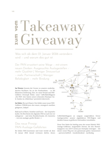 Takeaway Giveawayvom zumWas sich ab dem 01. Januar 2026 ver%u00e4ndern wird %u2013 und warum das gut ist.Der PAN erweitert seine Wege %u2013 mit einem neuen Denken: Ausgesuchte Auslagestellen %u2013 mehr Qualit%u00e4t | Weniger Streuverlust %u2013 mehr Partnerschaft | Weniger Beliebigkeit %u2013 mehr BindungIm Westen: Jenseits der Grenze zu unseren niederl%u00e4ndischen Nachbarn, bis an die Nordseek%u00fcste %u2013 in 210 Kilometern Entfernung. Dort, wo unser Freund und PANGef%u00e4hrte Christoph R%u00f6der, unser CoffeeTableMagazin%u201eDer PAN%u201c, den G%u00e4sten seiner schmucken Boutique-Style-Studios im %u201eR%u00f6derhaus%u201c pers%u00f6nlich %u00fcberreicht. Im S%u00fcden: Bis nach Kaarst. Dort bildet unser neuer PANGef%u00e4hrte CERAM.store den neuen, strategisch exzellent gelegenen %u201eS%u00fcdpol%u201c. Bald auch in Moers, Steinfurt und Essen %u2013 die Gespr%u00e4che laufen. Die Reichweite des digitalen PAN ist nach wie vor unbegrenzt %u2013 und ohne Bezahlschranke, d.h. kostenlos %u2013 wie sein analoger, gro%u00dfer Bruder ;-).Das neue Prinzip: PAN-Auslage-Gef%u00e4hrtenIhr lieben PAN-Leserinnen und Leser werdet ab dem01. Januar 2026 darauf vertrauen d%u00fcrfen, dieses CoffeeTableMagazin an sorgsam ausgew%u00e4hlten Orten/ Auslegerstellen unserer abgebildeten PAN-Region unddar%u00fcber hinaus in gr%u00f6%u00dferen St%u00fcckzahlen vorzufinden. Diese Orte findet ihr k%u00fcnftig unter der neuen Rubrik: PANAuslage-Gef%u00e4hrten. Ausgew%u00e4hlte Partner, die den Herstellungspreis von 2,83 %u20ac (netto) pro Exemplar mittragen %u2013 die diesen neuen Weg mit uns gemeinsam gehen: konzentriert %u2013 partnerschaftlich %u2013 kundenbindend %u2013 nachhaltig. 142