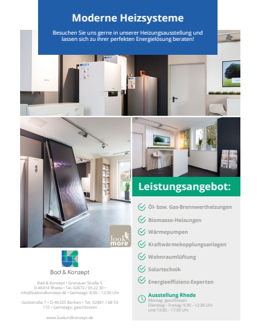Moderne HeizsystemeBesuchen Sie uns gerne in unserer Heizungsausstellung und lassen sich zu ihrer perfekten Energiel%u00f6sung beraten!Bad & Konzept %u2022 Gronauer Stra%u00dfe 5 D-46414 Rhede %u2022 Tel. 02872 / 93 22 30 %u2022 info@badundkonzept.de %u2022 Samstags: 8:30 %u2013 12:30 UhrGoldstra%u00dfe 7 %u2022 D-46325 Borken %u2022 Tel. 02861 / 68 53 110 %u2022 Samstags: geschlossenwww.badundkonzept.de%u00d6l- bzw. Gas-BrennwertheizungenBiomasse-HeizungenW%u00e4rmepumpenKraftw%u00e4rmekopplungsanlagenWohnrauml%u00fcftungSolartechnikEnergieeffi zienz-ExpertenLeistungsangebot:Ausstellung RhedeMontag: geschlossenDienstag %u2013 Freitag: 9:30 %u2013 12:30 Uhr und 13:30 %u2013 17:30 Uhr