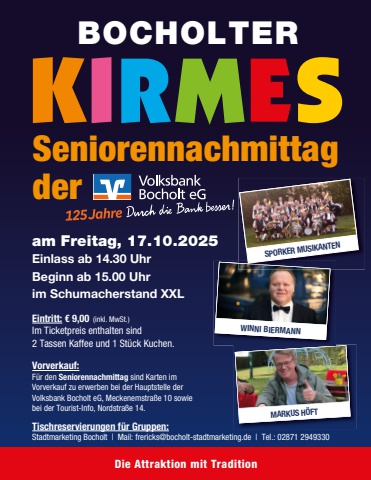 SeniorennachmittagderMARKUS H%u00d6FTWINNI BIERMANNSPORKER MUSIKANTENEintritt: %u20ac 9,00 (inkl. MwSt.) Im Ticketpreis enthalten sind 2 Tassen Kaffee und 1 St%u00fcck Kuchen. Vorverkauf:F%u00fcr den Seniorennachmittag sind Karten im Vorverkauf zu erwerben bei der Hauptstelle der Volksbank Bocholt eG, Meckenemstra%u00dfe 10 sowie bei der Tourist-Info, Nordstra%u00dfe 14.am Freitag, 17.10.2025 Einlass ab 14.30 Uhr Beginn ab 15.00 Uhrim Schumacherstand XXLDie Attraktion mit TraditionBOCHOLTERTischreservierungen f%u00fcr Gruppen:Stadtmarketing Bocholt | Mail: frericks@bocholt-stadtmarketing.de | Tel.: 02871 2949330