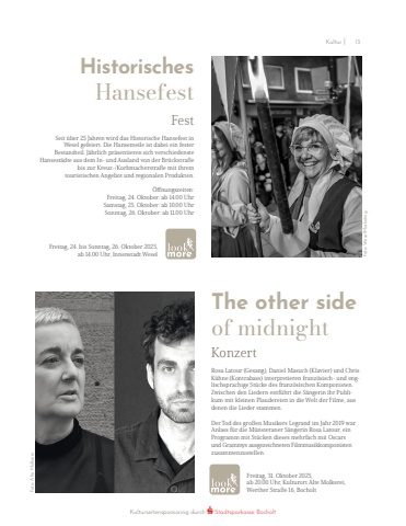 KonzertRosa Latour (Gesang), Daniel Masuch (Klavier) und Chris K%u00fchne (Kontrabass) interpretieren franz%u00f6sisch- und englischsprachige St%u00fccke des franz%u00f6sischen Komponisten. Zwischen den Liedern entf%u00fchrt die S%u00e4ngerin ihr Publikum mit kleinen Plaudereien in die Welt der Filme, aus denen die Lieder stammen.Der Tod des gro%u00dfen Musikers Legrand im Jahr 2019 war Anlass f%u00fcr die M%u00fcnsteraner S%u00e4ngerin Rosa Latour, ein Programm mit St%u00fccken dieses mehrfach mit Oscars und Grammys ausgezeichneten Filmmusikkomponisten zusammenzustellen.Freitag, 31. Oktober 2025,ab 20.00 Uhr, Kulturort Alte Molkerei,Werther Stra%u00dfe 16, BocholtThe other side of midnightHistorischesHansefestFestSeit %u00fcber 25 Jahren wird das Historische Hansefest in Wesel gefeiert. Die Hansemeile ist dabei ein fester Bestandteil. J%u00e4hrlich pr%u00e4sentieren sich verschiedenste Hansest%u00e4dte aus dem In- und Ausland von der Br%u00fcckstra%u00dfe bis zur Kreuz-/Korbmacherstra%u00dfe mit ihrem touristischen Angebot und regionalen Produkten. %u00d6ffnungszeiten:Freitag, 24. Oktober: ab 14.00 UhrSamstag, 25. Oktober: ab 10.00 UhrSonntag, 26. Oktober: ab 11.00 Uhr Freitag, 24. bis Sonntag, 26. Oktober 2025, ab 14.00 Uhr, Innenstadt Wesel Foto: WeselMarketingFoto: Alte MolkereiKulturseitensponsoring durch Stadtsparkasse BocholtKultur I 13