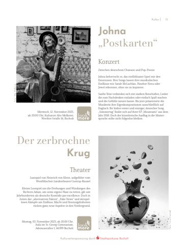 Johna%u201ePostkarten%u201cKonzertZwischen deutschem Chanson und Pop-PoesieJohna beherrscht es, das einf%u00fchlsame Spiel mit den Emotionen. Ihre Songs lassen ihre musikalischen Einfl%u00fcsse wie Sarah McLachlan, Heather Nova oder Jewel erkennen, ohne sie zu kopieren. Sanfte T%u00f6ne verbinden sich mit starken Botschaften, Lieder die zum Nachdenken einladen oder einfach Spa%u00df machen und die Gef%u00fchle tanzen lassen. Bis jetzt pr%u00e4sentierte die Musikerin ihre Eigenkompositionen ausschlie%u00dflich auf Englisch. Ihr bisher erster und einziger, deutscher Song %u201eSommertag%u201c findet sich auf ihrer EP %u201eMountains%u201c aus dem Jahr 2018. Doch der k%u00fcnstlerische Ausflug in die Muttersprache sollte nicht folgenlos bleiben.Mittwoch, 12. November 2025, ab 20.00 Uhr, Kulturort Alte Molkerei,Werther Stra%u00dfe 16, BocholtTheaterLustspiel von Heinrich von Kleist, aufgef%u00fchrt vom Westf%u00e4lischen Landestheater Castrop-RauxelKleists Lustspiel um die Drehungen und Windungen des Richters Adam, um seine eigene Haut zu retten, gilt seit Jahrhunderten als deutsche Kom%u00f6die par excellence. Doch in Zeiten der %u201ealternativen Fakten%u201c, %u201eFake News%u201c und skrupellosen K%u00e4mpfe um Einfluss, Macht und Deutungshoheiten r%u00fccken ganz neue Aspekte in den Vordergrund.Montag, 03. November 2025, ab 20.00 Uhr,Aula im St.-Georg-Gymnasium,Adenauerallee 1, 46399 BocholtDer zerbrochne KrugFoto: Timo HummelFoto: Alte MolkereiKulturseitensponsoring durch Stadtsparkasse BocholtKultur I 15