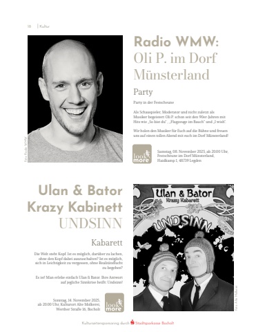 Radio WMW:Oli P. im Dorf M%u00fcnsterlandPartyParty in der FestscheuneAls Schauspieler, Moderator und nicht zuletzt als Musiker begeistert Oli P. schon seit den 90er-Jahren mit Hits wie %u201eSo bist du%u201c , %u201eFlugzeuge im Bauch%u201c und %u201eI wish%u201c. Wir holen den Musiker f%u00fcr Euch auf die B%u00fchne und freuen uns auf einen tollen Abend mit euch im Dorf M%u00fcnsterland!KabarettDie Welt steht Kopf. Ist es m%u00f6glich, dar%u00fcber zu lachen, ohne den Kopf dabei auszuschalten? Ist es m%u00f6glich, sich in Leichtigkeit zu vergessen, ohne Realit%u00e4tsflucht zu begehen?Es ist! Man erlebe einfach Ulan & Bator. Ihre Antwort auf jegliche Sinnkrise hei%u00dft: Undsinn!Sonntag, 14. November 2025, ab 20.00 Uhr, Kulturort Alte Molkerei,Werther Stra%u00dfe 16, BocholtFoto: Radio WMWUlan & Bator Krazy KabinettUNDSINNSamstag, 08. November 2025, ab 20.00 Uhr,Festscheune im Dorf M%u00fcnsterland,Haidkamp 1, 48739 LegdenFoto: Alte MolkereiKulturseitensponsoring durch Stadtsparkasse Bocholt18 I Kultur