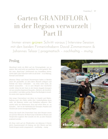 Immer einen gr%u00fcnen Schritt voraus | Interview-Session mit den beiden Firmeninhabern David Zimmermann & Johannes Telaar | pragmatisch %u2013 nachhaltig %u2013 mutigGarten GRANDIFLORAin der Region verwurzelt | Part IIPrologManchmal reicht ein Blick auf ein Firmengel%u00e4nde, um zusp%u00fcren: Hier wird nicht nur gearbeitet, hier wird gedacht. Wer das neue %u201eBaseCamp%u201c (Arbeitstitel) von Grandiflora betritt, merkt sofort, dass Gr%u00fcn hier mehr ist als Farbe %u2013 es ist Haltung, Konzept und Zukunft.Johannes Telaar und David Zimmermann haben in Bocholt einen Ort geschaffen, an dem Ideen Wurzeln schlagen und Technik mit Natur verhandelt %u2013 wo Gr%u00fcn mehr kann, als h%u00fcbsch auszusehen %u2013 wo es zum Beispiel eine Geschichte erz%u00e4hlt. Schon bei der Story in der letzten Ausgabe bewegten wir uns zwischen begr%u00fcnten Fassaden, %u201eD%u00e4chern, die Geschichten erz%u00e4hlen%u201c und dabei auf das Thema Nachhaltigkeit einzahlen sowie einer eigenen Akademie.Zwei junge Unternehmer mit Ideen im Gep%u00e4ck und Bodenhaftung unter den F%u00fc%u00dfen stellen klar: Landschaftsbau kann mehr, als Rabatten ziehen und Parkpl%u00e4tze pflastern. Hier w%u00e4chst nicht nur Kletterrosen, Kiwi und echter Wein etc. an Fassaden %u2013 hier ist der N%u00e4hrboden f%u00fcr Konzepte, Projekte und Visionen f%u00fcr unsere einzigartige Region.Genau das macht den Unterschied: Statt alter Rezepte setzen sie auf neue Mixturen. Ihr BaseCamp in Bocholt ist Beweis und Versprechen zugleich: Hier entsteht ein Ort, an dem Visionen praktisch werden.Ich freue mich auf ein Wiedersehen mit Johannes & David, deren Zusammenspiel ich bislang mit drei Worten auf den Punkt bringen w%u00fcrde: pragmatisch %u2013 nachhaltig %u2013 mutig.#BaseCamp Advertorial | Fotos: Kirsten Bu%u00df & Text: Roland Bu%u00dfCoverstory I 27
