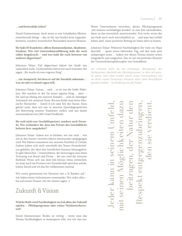 %u2026 und bestenfalls teilen?David Zimmermann: Auch wenn es wie Schubladen-Motivationsrhetorik klingt %u2013 das ist f%u00fcr uns beiden kein Lippenbekenntnis, sondern wesentlicher Bestandteil unserer Mission.Ihr habt 10 Teamleiter, offene Kommunikation, AkademieStruktur. Wie viel Unternehmensf%u00fchrung habt ihr euch selbst beigebracht %u2013 und was habt ihr euch bewusst von anderen abgeschaut?Johannes Telaar: Viel abgeschaut haben wir beide uns tats%u00e4chlich nicht. Und bisweilen h%u00f6ren wir auch Stimmen, die sagen: %u201eIhr macht eh euer eigenes Ding%u201c %u2026%u2026 ein Ausspruch, bei dem es auf die Tonalit%u00e4t ankommt %u2026 was sie oder er damit sagen will.Johannes Telaar: Genau %u2026 und %u2026 es ist nur die halbe Wahrheit. Wir machen in der Tat unser eigenes Ding %u2026 aber %u2026 f%u00fcr und im Dialog mit unseren Kunden %u2026 und im st%u00e4ndigen Austausch mit unserem Team. Bei uns findet man keine klassische Hierarchie %u2013 David & ich sind Teil des Teams. Dazu geh%u00f6rt auch, dass wir uns in unseren Quartalsgespr%u00e4chen der Bewertung unserer Teamleiter stellen und uns damit auseinandersetzen (360-Grad-Feedback).Ihr seid nicht nur Gesch%u00e4ftspartner, sondern auch Freunde. Wie verhindert ihr, dass das Private das Gesch%u00e4ftliche belastet bzw. umgekehrt?Johannes Telaar: Indem wir so bleiben, wie wir sind %u2026 wie wir in den letzten vierzehn Jahren miteinander umgegangen sind. Wir fahren zusammen mit unseren Familien in Urlaub. Zudem haben sich auch innerhalb des Teams Freundschaften gebildet, die %u00fcber den beruflichen Kontext hinausgehen. Es gibt Menschen / Unternehmen, die bevorzugen eine klare Trennung von Beruf und Privat %u2013 f%u00fcr uns sind die Grenzen flie%u00dfend. Wenn sich aus dem Job heraus etwas entwickelt, wo man auch im Privaten von Freundschaft sprechen w%u00fcrde, halten David und ich das f%u00fcr vollkommen normal.Wir treten gemeinsam bei Partnern wie z. B. Banken auf %u2013 wir haben keine Geheimnisse voreinander. Wir teilen alles %u2013 bis auf unsere Frauen, wie wir immer sagen ;-).Zukunft & VisionWelche Rolle wird Nachhaltigkeit im GaLaBau der Zukunft spielen %u2013 Pflichtprogramm oder echter Wettbewerbsvorteil?David Zimmermann: Beides ist richtig %u2013 wenn man dasThema Nachhaltigkeit so konsequent lebt, wie wir das tun. Wenn Unternehmen verstehen, dieses Pflichtprogramm %u201ewir m%u00fcssen nachhaltiger werden%u201c in eine K%u00fcr umzudenken, dann ist das wesentlich motivierender. Erst recht, wenn das am Ende auch noch wirtschaftlich ist %u2026 und man das Gef%u00fchl haben darf, einen positiven Beitrag im Sinne aller zu leisten.Johannes Telaar: W%u00e4hrend Nachhaltigkeit f%u00fcr viele ein Hype darstellt %u2026 quasi einen fahrenden Zug, auf den man jetzt aufspringen muss %u2026 haben wir dieses Thema immer schon mitgedacht und umgesetzt. Das ist ein wesentliches Element der Unternehmensphilosophie von Grandiflora.Ich erinnere mich an die erstmalige %u201eBesteigung%u201c des Dachgartens oberhalb des Meetingraumes, in dem wir gerade sitzen. Dort oben erz%u00e4hlt dieses junge Unternehmen, wie sie ihren neuen Firmensitz inmitten einer alten Brachfl%u00e4che gestaltet haben %u2013 im Einklang mit der Natur. Jeder kann in seinem Umfeld, mit seinen M%u00f6glichkeiten dazu beitragen, der Natur den Respekt entgegenzubringen, den sie verdient.Coverstory I 39
