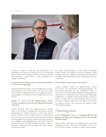 Wichtig zu wissen ist, dass die Mitarbeiterinnen und Mitarbeiter der Smart City GmbH sich um die Verwaltung dieser Fl%u00e4chen und Geb%u00e4ude k%u00fcmmern, w%u00e4hrend spezialisierte Betreiber %u2026 sprich P%u00e4chter %u2026 diese Immobilien und Anlagen unterhalten. Auf welche Kosten d%u00fcrfen sich die Parkenden einstellen, z. B. hier in der Tiefgarage? Thomas Kerkhoff: Das haben wir sehr griffig und mit Augenma%u00df kalkuliert: Eine Stunde Parken mit dem Auto kostet 1 Euro. Dank der Digitalisierung ist eine passgenaue Abrechnung m%u00f6glich, d. h. 45 Minuten kosten umgerechnet auch nur 75 Cent.Bleiben wir gerne bei der Digitalisierung, welche Vorteile versprecht ihr euch f%u00fcr die Zukunft des Parkens in Bocholt? Thomas Kerkhoff: Durch die Digitalisierung in Bocholt wird es f%u00fcr Besucher, perspektivisch betrachtet, deutlich komfortabler. Ich erkl%u00e4re das gerne an einem Bild, das die Zukunft abbilden k%u00f6nnte: Sobald jemand von au%u00dferhalb in sein Auto steigt, um zum Beispiel die Kreishandwerkerschaft am Europaplatz 17 zu besuchen, zeigt ihm eine App in Echtzeit die verf%u00fcgbaren Parkm%u00f6glichkeiten in der N%u00e4he. Zus%u00e4tzlich wird f%u00fcr ihn direkt ein freier Parkplatz reserviert, sodass er entspannt ankommen und sich ganz auf seinen Termin konzentrieren kann. Bei gro%u00dfen Veranstaltungen wie der beliebten Bocholter Kirmes werden auch gesperrte Bereiche angezeigt, sodass unn%u00f6tige Suchzeiten entfallen und Besucher sich gezielt auf verf%u00fcgbare Parkm%u00f6glichkeiten in der Umgebung konzentrieren k%u00f6nnen.Welche Effekte versprecht ihr euch als Stadt? Thomas Kerkhoff: Durch die Digitalisierung entsteht f%u00fcr Bocholt eine geschlossene Wertsch%u00f6pfungskette. Die Kennzeichenerkennung auf den Parkfl%u00e4chen liefert in Echtzeit wertvolle Daten %u00fcber die Herkunft der Besucher. Diese Informationen erm%u00f6glichen es der Stadt, gezielt Marketingma%u00dfnahmen zu ergreifen und Besucherstr%u00f6me optimal zu lenken. So kann man zum Beispiel gezielt G%u00e4ste aus einer bestimmten Region ansprechen und ihnen ein besonderes Angebot machen, was wiederum die gesamte lokale Wertsch%u00f6pfung st%u00e4rkt.Opening soon %u2026 In der Vergangenheit kam es zu Verz%u00f6gerungen bei der geplanten Er%u00f6ffnung der Tiefgarage. Wie ist der aktuelle Stand der Dinge? Michael K%u00f6ller: Wir haben die Er%u00f6ffnung der renovierten Tiefgarage f%u00fcr den 1. Dezember 2025 geplant. Wir tun alles, um diesen Termin einzuhalten, m%u00fcssen aber akzeptie58 I Portrait