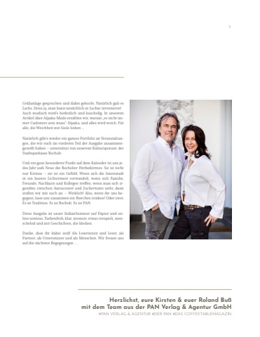Geldanlage gesprochen und dabei gekocht. Nat%u00fcrlich gab es Lachs. Denn ja, man kann tats%u00e4chlich in Lachse investieren!Auch modisch wird%u2019s herbstlich und kuschelig. In unserem Artikel %u00fcber%u00a0Alpaka-Mode%u00a0erz%u00e4hlen wir, warum%u00a0%u201ees nicht immer Cashmere sein muss%u201c.%u00a0Alpaka, und alles wird weich.%u00a0F%u00fcr alle, die Weichheit mit Seele lieben ...Nat%u00fcrlich gibt%u2019s wieder ein ganzes Portfolio an Veranstaltungen, die wir euch im vorderen Teil der Ausgabe zusammengestellt haben %u2013%u00a0unterst%u00fctzt von unserem Kultursponsor, der Stadtsparkasse Bocholt.Und ein ganz besonderer Punkt auf dem Kalender ist uns jedes Jahr aufs Neue die Bocholter Herbstkirmes. Sie ist nicht nur Kirmes %u2013 sie ist ein Gef%u00fchl. Wenn sich die Innenstadt in ein buntes Lichtermeer verwandelt, wenn sich Familie, Freunde, Nachbarn und Kollegen treffen, wenn man sich irgendwo zwischen Autoscooter und Zuckerwatte sieht, dann sto%u00dfen wir mit euch an. %u2013 Wirklich! Also, wenn ihr uns begegnet, lasst uns zusammen ein Bierchen trinken!%u00a0Oder zwei. Es ist Tradition. Es ist Bocholt. Es ist PAN.Diese Ausgabe ist unser IndianSummer auf Papier und online sowieso. Farbenfroh, klar, intensiv, etwas verspielt, menschelnd und mit Geschichten, die bleiben.Danke, dass ihr dabei seid! Als Leserinnen und Leser, als Partner, als Unterst%u00fctzer und als Menschen. Wir freuen uns auf die n%u00e4chsten Begegnungen %u2026Herzlichst, eure Kirsten & euer Roland Bu%u00df mit dem Team aus der PAN Verlag & Agentur GmbH#PAN VERLAG & AGENTUR #DER PAN #DAS COFFEETABLEMAGAZIN5