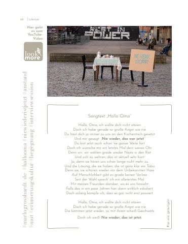 Songtext %u201eHallo Oma%u201c Hallo, Oma, ich wollte dich nicht st%u00f6renDoch ich habe gerade so gro%u00dfe Angst wie nieDu hast dich ja immer zu uns an den K%u00fcchentisch gesetztUnd mir gesagt: %u201eNie wieder, das war jetzt%u201cDu bist jetzt auch schon 'ne ganze Weile fortDoch ich w%u00fcnsche mir ein letztes Mal dein weises OhrDenn wir, wir w%u00e4hlen grade wieder Nazis in den RatUnd sich zu wehren, das ist aktuell sehr hartJa, denn sie h%u00f6ren uns schon lange nicht mehr zuUnd die L%u00f6sung, die sie haben, die ist ganz klar ein TabuDenn sie, sie sch%u00fcren wieder vor dem Unbekannten HassAuf Menschlichkeit gibt es grade keinen VerlassSeit der Wahl sprech' ich ein allererstes MalMit meinen Freunden dar%u00fcber, wo es uns hinziehtFalls das in ein paar Jahren hier dann wirklich eskaliertDoch solang k%u00e4mpfe ich, dass es gar nicht erst passiertHallo, Oma, ich wollte dich nicht st%u00f6renDoch ich habe gerade so gro%u00dfe Angst wie nieDie kommen jetzt wieder, ja, mit ihrem schei%u00df Geschw%u00e4tzDoch ich wei%u00df: Nie wieder, das ist jetzt.Hier gehtes zumYouTubeVideo #marlogrosshardt/de #hallooma #niewiederistjetzt #anstand #mut #erinnerungskultur #begegnung #interviewsession #so wie gesungen68 I Lifestyle