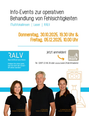 Info-Events zur operativenBehandlung von FehlsichtigkeitenMultifokallinsen %u2502 Laser %u2502 RALVReal Artificial Lens VisionErleben Sie schon jetzt, wie Sie nach der LinsenOP sehen werden!Donnerstag, 30.10.2025, 19.30 Uhr & Freitag, 05.12.2025, 10.00 UhrJetzt anmelden!Dr. Friederike D%u00f6rner (FEBO) Fach%u00e4rztin f%u00fcr AugenheilkundeRALV Real Artificial Lens VisionDr. Johanna D%u00f6rner Fach%u00e4rztin f%u00fcr AugenheilkundeDr. Martin D%u00f6rner Facharzt f%u00fcr AugenheilkundeTel.: 02871 22 66 26 oder www.Laser-24.de/infoabend