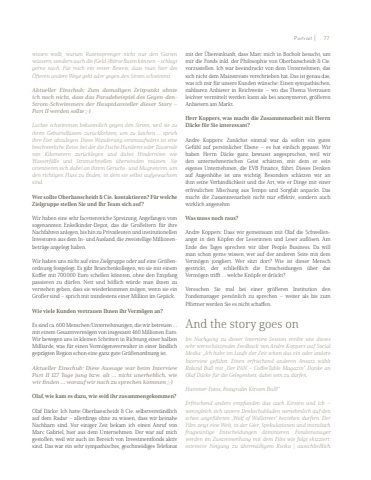 wissen wollt, warum Rasensprenger nicht nur den Garten w%u00e4ssern, sondern auch die (Geld-)B%u00f6rse fluten k%u00f6nnen %u2013 schlagt gerne nach. F%u00fcr mich ein erster Beweis, dass man hier des %u00d6fteren andere Wege geht oder gegen den Strom schwimmt.Aktueller Einschub: Zum damaligen Zeitpunkt ahnte ich noch nicht, dass das Paradebeispiel des Gegen-denStrom-Schwimmers der Hauptdarsteller dieser Story %u2013 Part II werden sollte ;-)Lachse schwimmen bekanntlich gegen den Strom, weil sie zu ihren Geburtsfl%u00fcssen zur%u00fcckkehren, um zu laichen ... sprich ihre Eier abzulegen. Diese Wanderung stromaufw%u00e4rts ist eine beschwerliche Reise, bei der die Fische Hunderte oder Tausendevon Kilometern zur%u00fccklegen und dabei Hindernisse wie Wasserf%u00e4lle und Stromschnellen %u00fcberwinden m%u00fcssen. Sie orientieren sich dabei an ihrem Geruchs- und Magnetsinn, um den richtigen Fluss zu finden, in dem sie selbst aufgewachsen sind.Wer sollte Oberbanscheidt & Cie. kontaktieren? F%u00fcr welche Zielgruppe stellen Sie und Ihr Team sich auf? Wir haben eine sehr facettenreiche Spreizung. Angefangen vom sogenannten Enkelkinder-Depot, das die Gro%u00dfeltern f%u00fcr ihre Nachfahren anlegen, bis hin zu Privatleuten und institutionellen Investoren aus dem In- und Ausland, die zweistellige Millionenbetr%u00e4ge angelegt haben. Wir haben uns nicht auf eine Zielgruppe oder auf eine Gr%u00f6%u00dfenordnung festgelegt. Es gibt Branchenkollegen, wo sie mit einem Koffer mit 700.000 Euro schellen k%u00f6nnten, ohne den Empfang passieren zu d%u00fcrfen. Nett und h%u00f6flich w%u00fcrde man ihnen zu verstehen geben, dass sie wiederkommen m%u00f6gen, wenn sie ein Gro%u00dfer sind %u2013 sprich mit mindestens einer Million im Gep%u00e4ck. Wie viele Kunden vertrauen Ihnen ihr Verm%u00f6gen an? Es sind ca. 600 Menschen/Unternehmungen, die wir betreuen %u2026 mit einem Gesamtverm%u00f6gen von insgesamt 460 Millionen Euro. Wir bewegen uns in kleinen Schritten in Richtung einer halben Milliarde, was f%u00fcr einen Verm%u00f6gensverwalter in einer l%u00e4ndlich gepr%u00e4gten Region schon eine ganz gute Gr%u00f6%u00dfenordnung ist. Aktueller Einschub: Diese Aussage war beim Interview Part II 127 Tage jung bzw. alt %u2026 nicht unerheblich, wie wir finden %u2026 worauf wir noch zu sprechen kommen ;-)Olaf, wie kam es dazu, wie seid ihr zusammengekommen?Olaf D%u00e4cke: Ich hatte Oberbanscheidt & Cie. selbstverst%u00e4ndlich auf dem Radar %u2013 allerdings ohne zu wissen, dass wir beinahe Nachbarn sind. Vor einiger Zeit bekam ich einen Anruf von Marc Gabriel, hier aus dem Unternehmen. Der war auf mich gesto%u00dfen, weil wir auch im Bereich von Investmentfonds aktiv sind. Das war ein sehr sympathisches, geschmeidiges Telefonat mit der %u00dcbereinkunft, dass Marc mich in Bocholt besucht, um mir die Fonds inkl. der Philosophie von Oberbanscheidt & Cie. vorzustellen. Ich war beeindruckt von dem Unternehmen, das sich nicht dem Mainstream verschrieben hat. Das ist genau das, was ich mir f%u00fcr unsere Kunden w%u00fcnsche: Einen sympathischen, nahbaren Anbieter in Reichweite %u2013 wo das Thema Vertrauen leichter vermittelt werden kann als bei anonymeren, gr%u00f6%u00dferen Anbietern am Markt.Herr Koppers, was macht die Zusammenarbeit mit Herrn D%u00e4cke f%u00fcr Sie interessant?Andre Koppers: Zun%u00e4chst einmal war da sofort ein gutesGef%u00fchl auf pers%u00f6nlicher Ebene %u2013 es hat einfach gepasst. Wir haben Herrn D%u00e4cke ganz bewusst angesprochen, weil wir den unternehmerischen Geist sch%u00e4tzen, mit dem er sein eigenes Unternehmen, die EVB Finance, f%u00fchrt. Dieses Denken auf Augenh%u00f6he ist uns wichtig. Besonders sch%u00e4tzen wir an ihm seine Verbindlichkeit und die Art, wie er Dinge mit einer erfreulichen Mischung aus Tempo und Sorgfalt anpackt. Das macht die Zusammenarbeit nicht nur effektiv, sondern auch wirklich angenehm.Was muss noch raus? Andre Koppers: Dass wir gemeinsam mit Olaf die Schwellenangst in den K%u00f6pfen der Leserinnen und Leser aufl%u00f6sen. Am Ende des Tages sprechen wir %u00fcber People Business. Da will man schon gerne wissen, wer auf der anderen Seite mit dem Verm%u00f6gen jongliert. Wer sitzt dort? Wie ist dieser Mensch gestrickt, der schlie%u00dflich die Entscheidungen %u00fcber das Verm%u00f6gen trifft %u2026 welche Kn%u00f6pfe er dr%u00fcckt? Versuchen Sie mal bei einer gr%u00f6%u00dferen Institution den Fondsmanager pers%u00f6nlich zu sprechen %u2013 weiter als bis zum Pf%u00f6rtner werden Sie es nicht schaffen.And the story goes on Im Nachgang zu dieser Interview-Session ereilte uns dieses sehr wertsch%u00e4tzendes Feedback von Andre Koppers auf Social Media: %u201eIch habe im Laufe der Zeit schon das ein oder andereInterview gef%u00fchrt. Einen erfrischend anderen Ansatz w%u00e4hlt Roland Bu%u00df mit %u201eDer PAN %u2013 CoffeeTable Magazin\Olaf D%u00e4cke f%u00fcr die Gelegenheit, dabei sein zu d%u00fcrfen.Hammer-Fotos, Fotografin Kirsten Bu%u00df!%u201cErfrischend anders empfanden das auch Kirsten und ich %u2013 wenngleich sich unsere Denkschubladen vornehmlich auf den schon angef%u00fchrten %u201eWolf of Wallstreet%u201c beziehen durften. Der Film zeigt eine Welt, in der Gier, Spekulationen und moralisch fragw%u00fcrdige Entscheidungen dominieren. Fondsmanager werden im Zusammenhang mit dem Film wie folgt skizziert: extensive Neigung zu %u00fcberm%u00e4%u00dfigem Risiko | ausschlie%u00dflich Portrait I 77