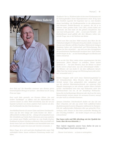 dem iPad auf: Die Bouteillen stammen vom %u00e4ltesten privat bewirtschafteten Weingut in Sachsen %u2013 dem Besitz von Dr. Georg Prinz zur Lippe.Kurz nach links gewischt, um Kirstens Album %u201eJan und andere Fischk%u00f6ppe%u201c zu %u00f6ffnen und die Impressionen mit unseren G%u00e4sten zu teilen. Wohl versichernd, dass die vor uns liegende Lachseite von einem anderen Fisch stammt als dem, den Fischh%u00e4ndler Jan f%u00fcrs Foto beschmust ;-)Anschlie%u00dfend bereite ich unsere G%u00e4ste und deren Geschmackssinne auf die drei G%u00e4nge der Lachs-Session vor. Marc %u2026 offensichtlich ein Mann der Tat %u2026 dr%u00e4ngt sich sympathisch zum Mit-Schnibbeln auf. Solche Koch-Aktivisten setzt man tunlichst erst einmal unter Waffen und bittet sie, eine Knolle frischen Knoblauch in feinste Scheiben zu filetieren. Man verschafft sich damit etwas Luft zum Nachdenken und bestenfalls kann man den Knoblauch sp%u00e4ter bei einem der Gerichte verwenden ;-) Marcs Frage, ob er sich nach dem Knoblauch den roten Chili vorkn%u00f6pfen k%u00f6nne, lassen verblasste Erinnerung wieder aufleben: Flashback: Vor ca. 20 Jahren habe ich bei einer Kochsession mit 65 F%u00fchrungskr%u00e4ften einem Hyperaktivisten einen 10-kg-Sack rote Zwiebeln zugeteilt. Der Ingenieur war ca. zwei Stunden damit besch%u00e4ftigt, die Knollengew%u00e4chse in die akkuratestenund kleinsten Zwiebel-Brunoise zu sezieren, die ich je in meinem Leben gesehen habe. Circa 200 g davon haben wir verwendet, den Rest habe ich ihn gebeten einzufrieren. Das war zwar nicht ganz fair %u2026 aber %u2026 es war pure Notwehr %u2026 der K%u00fcchenfreund stand gef%u00fchlt alle drei Minuten neben mir,mit der Frage, was er als N%u00e4chstes tun k%u00f6nne. Zur%u00fcck zum Hier und Jetzt: Wohl wissend, dass Marc f%u00fcr die Chilischote lediglich 72 Sekunden brauchen d%u00fcrfte, versorge ich ihn mit zwei H%u00e4nden voll Mini-Paprikas. W%u00e4hrend der leidigen Pandemie haben sich Leidenschaft und Wertsch%u00e4tzung f%u00fcrs Kochen bei ihm entwickelt %u2013 was sich aus dem Arrangement der geschnittenen Paprikaw%u00fcrfel rauslesen l%u00e4sst. Nach Farben sortiert liegen sie da %u2026 an die Nationalflaggen von Mexiko und Indien erinnernd. Es ist an der Zeit, Marc neben einem angemessenen Lob den Spitznamen %u201eMarci Masser%u201c zu verleihen. Dieser nimmt dankend an %u2026 mit dem Hinweis, dass die Messer in dieserK%u00fcche extrem scharf seien, was den Schneidespa%u00df erh%u00f6he %u2013 ein Elfmeter, der von Andre K. mit dem s%u00fcffisanten Spruch: %u201eMein Vater hat immer gesagt, mit Werkzeug kann jeder arbeiten%u201c verwandelt wird ;-) Kirsten hingegen sieht noch etwas Optimierungsbedarf in der Schneidetechnik. Mein Hinweis, dass die FeedbackTechnik meiner Frau gelegentlich eher suboptimal und aus der gleichen Motivationsschmiede wie seinerzeit FelixMagath entsprungen zu sein scheint, zaubert Marcs L%u00e4cheln zur%u00fcck. Anschlie%u00dfend setzt eine rege Diskussion unter den Oberbanscheidt Cies ein, ob der diesj%u00e4hrige Weihnachtsbonus f%u00fcr ein hochkar%u00e4tiges Messerset oder doch nur f%u00fcr einen Messersch%u00e4rfer reichen w%u00fcrde. Ich vermutete Ersteres, worauf wir aber noch zu schreiben kommen. Apropos Schreiben: Zwischendurch d%u00fcrfen wir das Lob von Marc erhaschen, der den aus seiner Sicht auffallend hohen Qualit%u00e4tsstandard unseres Magazins wohltuend ins Rampenlicht der aufkeimenden Diskussion %u00fcber gut gemachte Printwerbung stellt. Kirsten ist ihm beim passenden Wording f%u00fcr den Umschlag behilflich %u2013 die beiden einigen sich auf %u201eHand schmeichelnd%u201c.Das Ganze steht und f%u00e4llt allerdings mit der Qualit%u00e4t der Leute, %u00fcber die was drinsteht ;-) Marc Gabriel: Angesichts unserer Story d%u00fcrftet ihr jetzt in Richtung Magazin-Award unterwegs sein ;-) %u2026 Humor-Level stimmt %u2026 so kann es weitergehen.Marc GabrielPortrait 81 I