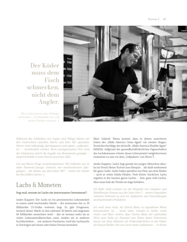 W%u00e4hrend des Schl%u00fcrfens von Suppe und Village kl%u00e4ren wir den Unterschied zwischen Sherry und Port. Der spanische Sherry wird vollst%u00e4ndig durchgegoren und sp%u00e4ter %u201eaufgespritet%u201c %u2013%u00a0 vornehmlich trocken. Beim portugiesischen Port wird der G%u00e4rprozess durch die Zugabe von Branntwein gestoppt %u2013 dadurch beh%u00e4lt er seine Frucht und seine S%u00fc%u00dfe. Um auf Marcs Frage zur%u00fcckzukommen: Wir befinden uns in einer Portwein-Lounge, inmitten von verschiedensten Jahrg%u00e4ngen %u2013 der %u00e4lteste aus dem Jahre 1927 %u2013 womit wir wieder bei den Zahlen w%u00e4ren ;-)Lachs & MonetenSagt mal, warum ist Lachs ein interessantes Investment?Andre Koppers: Der Lachs ist ein proteinreiches Lebensmittel in einem stark wachsenden Markt %u2013 der momentan bei ca. 19 Milliarden US-Dollar weltweit liegt. Es gibt Prognosen,wonach dieser Markt in den n%u00e4chsten 10 Jahren auf insgesamt 44 Milliarden anwachsen wird %u2013 das ist weitaus mehr als in vielen Lebensmittelbereichen sonst. Anders als in anderen Zuchtbetrieben %u2026 mit anderen Fischarten, wird die Lachszucht in Norwegen auf einem sehr hohen Niveau betrieben. Marc Gabriel: Hinzu kommt, dass in diesen unsicheren Zeiten des %u201eMake America Great Again%u201c ein zweiter Slogan/Trend durchschl%u00e4gt, der da hei%u00dft: %u201eMake America Healthy Again%u201c (MAHA). Aufgrund der gesundheitsf%u00f6rderlichen Eigenschaften des Lachskonsums scheint dieses Lebensmittel m%u00f6glicherweise resistenter zu sein vor dem %u201eZollpokern%u201c von Herrn T. Andre Koppers: Lachs liegt gerade bei jungen Menschen absolut im Trend. Meine Tochter zum Beispiel %u2026 die l%u00e4uft meilenweit f%u00fcr gutes Sushi. Sushi-L%u00e4den sprie%u00dfen wie Pilze aus dem Boden %u2013 auch in vielen Edeka-Filialen. Viele kleine St%u00fcckchen Lachs ergeben in der Summe ganze Lachse %u2026 bzw. ganz viele Lachse. Man muss halt die Trends im Auge behalten..Ich f%u00fchle mich erinnert an die Beispiele von Gardena und Heidelberger Zement aus der Story Part I %u2013%u00a0unsere Gegen%u00fcber scheinen hellwach zu sein im Aufsp%u00fcren von Entwicklungen und boomenden Produkten. Ich wei%u00df zwar nicht, ob Chenin Blanc in irgendeiner Weiseb%u00f6rsennotiert ist %u2026 wenn nicht, schadet es nichts, wenn Andre und Marc wissen, dass Chenin Blanc der optimalste Wein zum Sushi ist. Passend zum Teilen dieser Erkenntnis lassen wir diese Rebsorte als Probeschl%u00fcckchen in die Gl%u00e4ser der Runde flie%u00dfen. Bei uns noch relativ unbekannt %u2026 in ihrem Der K%u00f6der muss dem Fisch schmecken, nicht dem Angler.Der Lachs k%u00f6nnte dem Anleger schmecken %u2013 Fischh%u00e4ndler Jan und seinen Kunden sowieso ;-)Portrait I 87