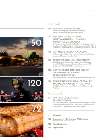 4 Editorial136 Gastautorin | Dr. Simone M%u00f6llenbeckWenn das Herz nicht mehr will ...138 Pan-Gef%u00e4hrten144 ImpressumPortrait50 BOCHOLT UNDERGROUNDWarum die TIEFgarage unter dem Europaplatzein HOCHbauprojekt der besonderen Art ist72 AUF %u2019NEN LACHS MIT DEN FONDSMANAGERN %u2026 QUASI IN ARML%u00c4NGE ZU BOCHOLT Pentalog zwischen dem Gesch%u00e4ftsf%u00fchrer Andre Koppers und Kundendirektor Marc Gabriel %u2013 Oberbanscheidt & Cie. (Kleve), Olaf D%u00e4cke %u2013%u00a0EVB Vertriebs KG (Bocholt) und dem PAN | Part II112 PAN MEETS REDDOT-GALA 2025 7h 51min voller Sch%u00f6nheiten %u2013 von beeindruckenden Designs bis zu den Menschen aus aller Welt118 BEGEISTERUNG, NEU KOMPONIERT Raindance Alive. Ein vertrauter Name. Ein vollkommen neues Gef%u00fchl | jetzt auch in der Ausstellung unseres PAN- Gef%u00e4hrten T-RAUMWELTEN by Elsenbusch120 A.S.V. EINIGKEIT BOCHOLT 1894 E.V. DIE RENAISSANCE EINES TRADITIONSVEREINS Mehr als nur Boxen #Verst%u00e4ndnis #Freundschaft #Integration128 EIN KLEINES JUBIL%u00c4UM | DREI JAHREMICHAELAS GARTEN IN HOLTWICK Drei Jahre voller neuer Ideen, Pflanzen, Herzblut und tollen ProjektenKulinarik104 ROCHENFL%u00dcGEL MEETSPAN PINOT NOIR Ein Fisch ohne Gr%u00e4ten. Unterlassene Hilfeleistung am Gaumen %u201eMinus mal Minus ergibt PLUS%u201c oder auch %u201eZweimal um die Ecke gedacht %u2026 ergibt Mega-Spa%u00df-am-Gaumen%u201c5068721207