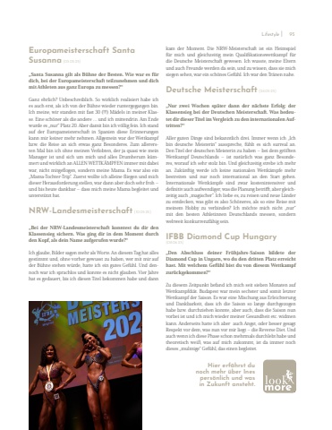 kam der Moment. Die NRW-Meisterschaft ist ein Heimspiel f%u00fcr mich und gleichzeitig mein Qualifikationswettkampf f%u00fcr die Deutsche Meisterschaft gewesen. Ich wusste, meine Eltern und auch Freunde werden da sein, und zu wissen, dass sie mich siegen sehen, war ein sch%u00f6nes Gef%u00fchl. Ich war den Tr%u00e4nen nahe. Deutsche Meisterschaft (24.05.25)%u201eNur zwei Wochen sp%u00e4ter dann der n%u00e4chste Erfolg: der Klassensieg bei der Deutschen Meisterschaft. Was bedeutet dir dieser Titel im Vergleich zu den internationalen Auftritten?%u201cAller guten Dinge sind bekanntlich drei. Immer wenn ich %u201eIch bin deutsche Meisterin%u201c ausspreche, f%u00fchlt es sich surreal an. Den Titel der deutschen Meisterin zu haben %u2013 bei dem gr%u00f6%u00dften Wettkampf Deutschlands %u2013 ist nat%u00fcrlich was ganz Besonderes, worauf ich sehr stolz bin. Und gleichzeitig strebe ich mehr an. Zuk%u00fcnftig werde ich keine nationalen Wettk%u00e4mpfe mehr bestreiten und nur noch international an den Start gehen. Internationale Wettk%u00e4mpfe sind zwar kostenintensiver und definitiv auch aufwendiger, was die Planung betrifft, aber gleichzeitig auch %u201emagischer%u201c. Ich liebe es, zu reisen und neue L%u00e4nder zu entdecken, was gibt es also Sch%u00f6neres, als so eine Reise mit meinem Hobby zu verbinden? Ich m%u00f6chte mich nicht %u201enur%u201cmit den besten Athletinnen Deutschlands messen, sondern weltweit konkurrenzf%u00e4hig sein. IFBB Diamond Cup Hungary(08.06.25)%u201eDen Abschluss deiner Fr%u00fchjahrs-Saison bildete der Diamond Cup in Ungarn, wo du den dritten Platz erreicht hast. Mit welchem Gef%u00fchl bist du von diesem Wettkampf zur%u00fcckgekommen?%u201cZu diesem Zeitpunkt befand ich mich seit sieben Monaten auf Wettkampfdi%u00e4t. Budapest war mein sechster und somit letzter Wettkampf der Saison. Es war eine Mischung aus Erleichterung und Dankbarkeit, dass ich die Saison so lange durchgezogen habe bzw. durchziehen konnte, aber auch, dass die Saison nun vorbei ist und ich mich wieder meiner Gesundheit etc. widmen kann. Anderseits hatte ich aber auch Angst, oder besser gesagt Respekt vor dem, was nun vor mir liegt %u2013 die Reverse Diet. Und auch wenn ich diese Phase schon mehrmals durchlebt habe und theoretisch wei%u00df, was auf mich zukommt, ist da immer noch dieses %u201emulmige%u201c Gef%u00fchl, das einen begleitet.Europameisterschaft SantaSusanna (03.05.25)%u201eSanta Susanna gilt als B%u00fchne der Besten. Wie war es f%u00fcr dich, bei der Europameisterschaft teilzunehmen und dich mit Athleten aus ganz Europa zu messen?%u201cGanz ehrlich? Unbeschreiblich. So wirklich realisiert habe ich es auch erst, als ich von der B%u00fchne wieder runtergegangen bin. Ich meine, wir standen mit fast 30 (!!!) M%u00e4dels in meiner Klasse. Eine sch%u00f6ner als die andere %u2026 und ich mittendrin. Am Ende wurde es %u201enur%u201c Platz 20. Aber damit bin ich v%u00f6llig fein. Ich stand auf der Europameisterschaft in Spanien diese Erinnerungen kann mir keiner mehr nehmen. Allgemein war der Wettkampf bzw. die Reise an sich etwas ganz Besonderes. Zum allerersten Mal bin ich ohne meinen Verlobten, der ja quasi wie meinManager ist und sich um mich und alles Drumherum k%u00fcmmert und wirklich an ALLEN WETTK%u00c4MPFEN immer mit dabei war, nicht mitgeflogen, sondern meine Mama. Es war also ein %u201eMama-Tochter-Trip%u201c. Zuerst wollte ich alleine fliegen und mich dieser Herausforderung stellen, war dann aber doch sehr froh %u2013 und bis heute dankbar %u2013 dass mich meine Mama begleitet und unterst%u00fctzt hat.NRW-Landesmeisterschaft (10.05.25)%u201eBei der NRW-Landesmeisterschaft konntest du dir den Klassensieg sichern. Was ging dir in dem Moment durch den Kopf, als dein Name aufgerufen wurde?%u201cIch glaube, Bilder sagen mehr als Worte. An diesem Tag hat alles gestimmt und, ohne vorher gewusst zu haben, wer mit mir auf der B%u00fchne stehen w%u00fcrde, hatte ich ein gutes Gef%u00fchl. Und dennoch war ich sprachlos und konnte es nicht glauben. Vier Jahre hat es gedauert, bis ich diesen Titel bekommen habe und dann Hier erf%u00e4hrst du noch mehr %u00fcber Ines pers%u00f6nlich und wasin Zukunft ansteht.Lifestyle I 95